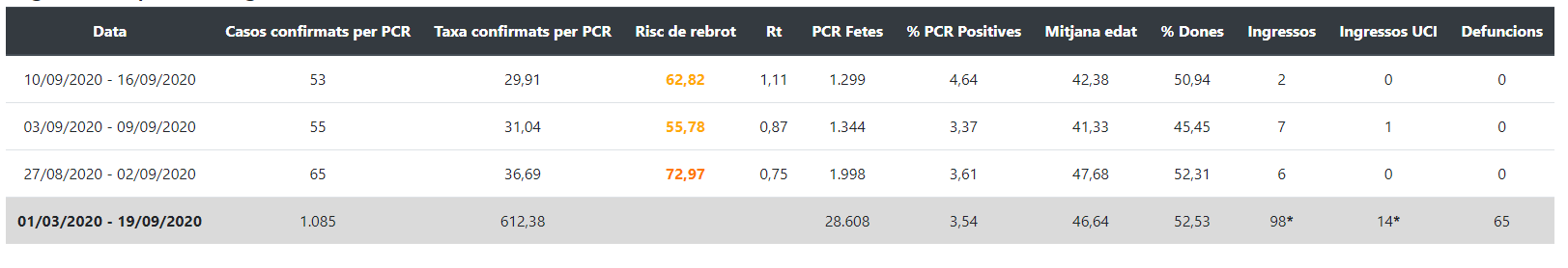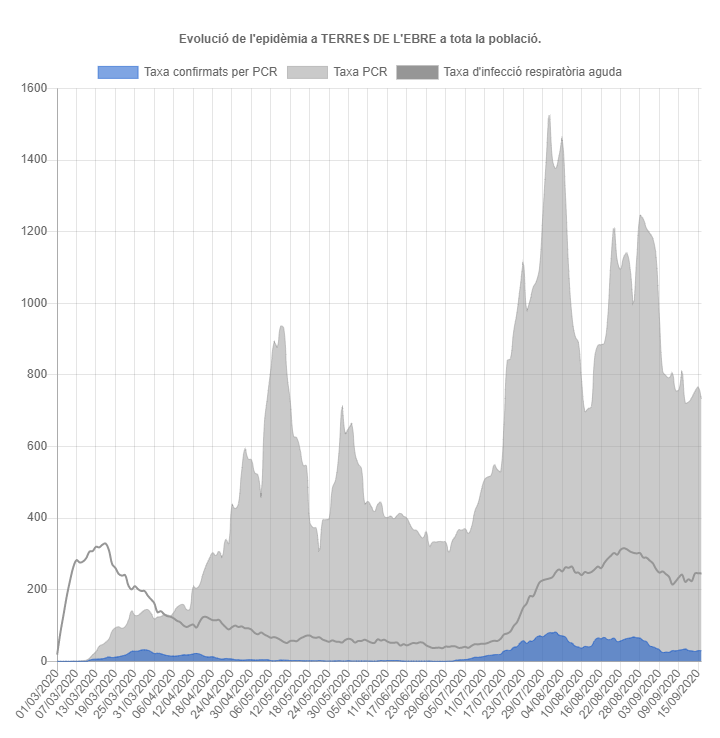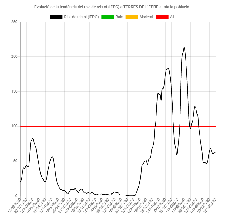La regió de les Terres de l’Ebre acumula, des de l’inici de la pandèmia, 1.085 casos confirmats per PCR, 10 més que en el balanç anterior, i 1.271 si es tenen en compte la resta de proves. En aquesta regió han mort 65 persones, cap més respecte a l’últim balanç. El risc de rebrot augmenta i se situa al 62,82, quasi 1 punt menys respecte a les dades d’ahir. Per altra banda, la taxa de confirmats per PCR en els darrers set dies és de 29,91 per 100.000 habitants, mentre que l’Rt, és a dir, la velocitat de propagació del virus és d’1,11 i ha baixat un 0,5. Segons aquest últim balanç hi ha 3 pacients ingressats als hospitals, un dels quals a l’UCI.