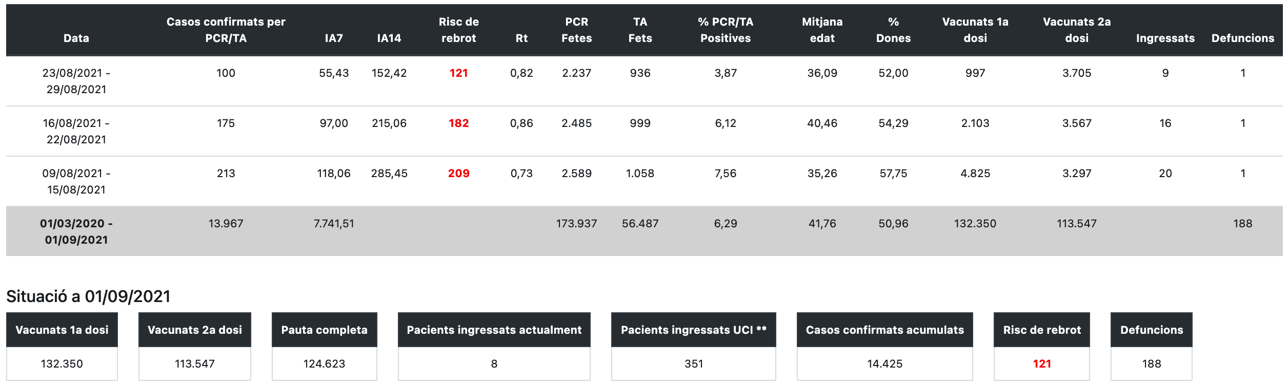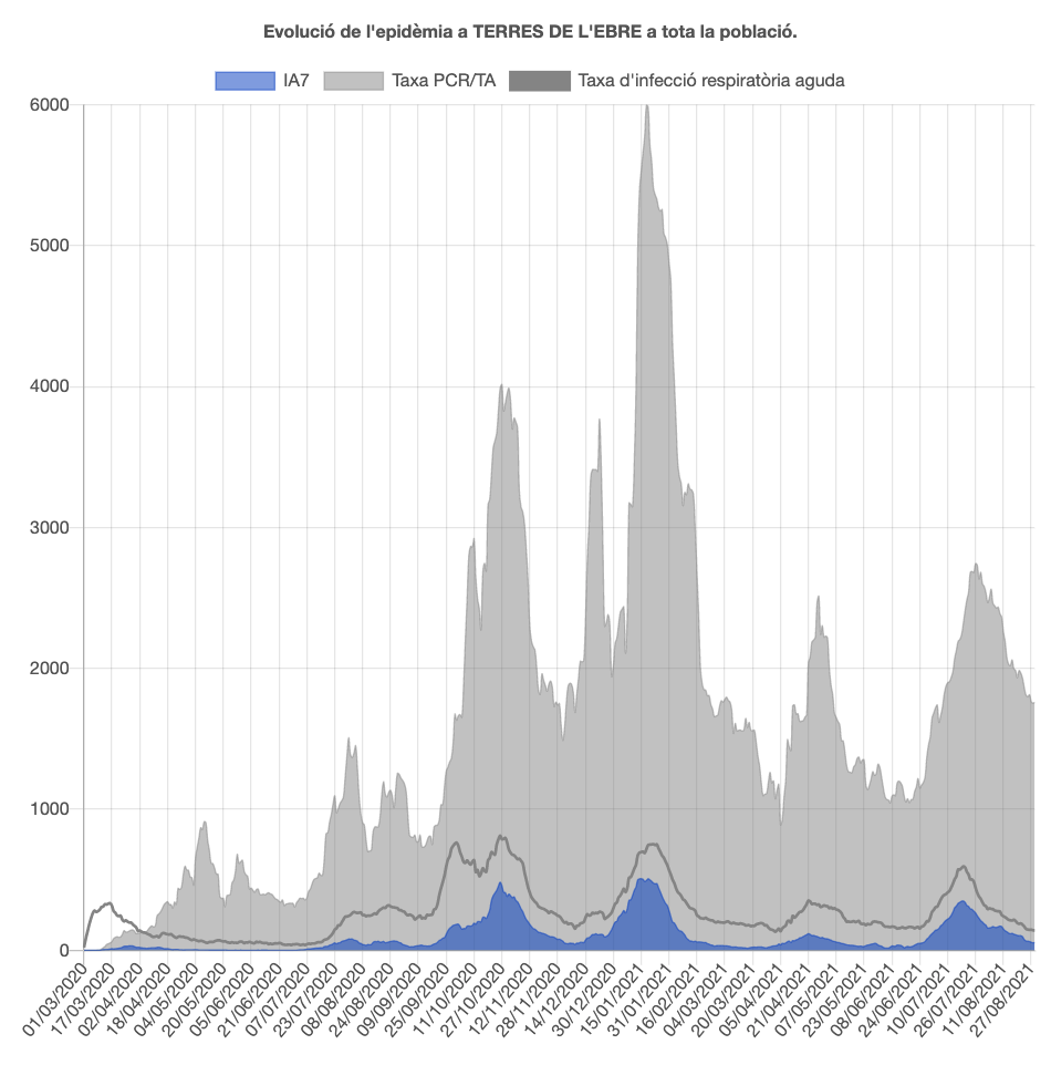 El 3,87% de les proves que es fan donen positiu i no s’ha detectat cap nova mort i el total és de 188. Les últimes defuncions havien tingut lloc dels dies 17 i 25 d’agost. Al mes de juliol hi va haver quatre morts per coronavirus a les Terres de l’Ebre i al juny una.
