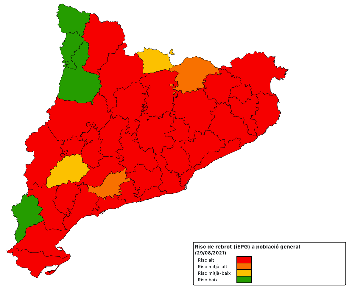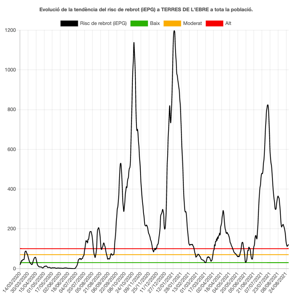 La pandèmia segueix a la baixa, ja que la velocitat de contagi (Rt) a les Terres de l’Ebre és inferior a l’1, però puja 4 centèsimes fins a 0,82. El risc de rebrot també puja lleugerament 2 punts i és de 121, alt. Té un risc molt baix la Terra Alta (12) i alt la Ribera d’Ebre (147), el Baix Ebre (134) i el Montsià (145).