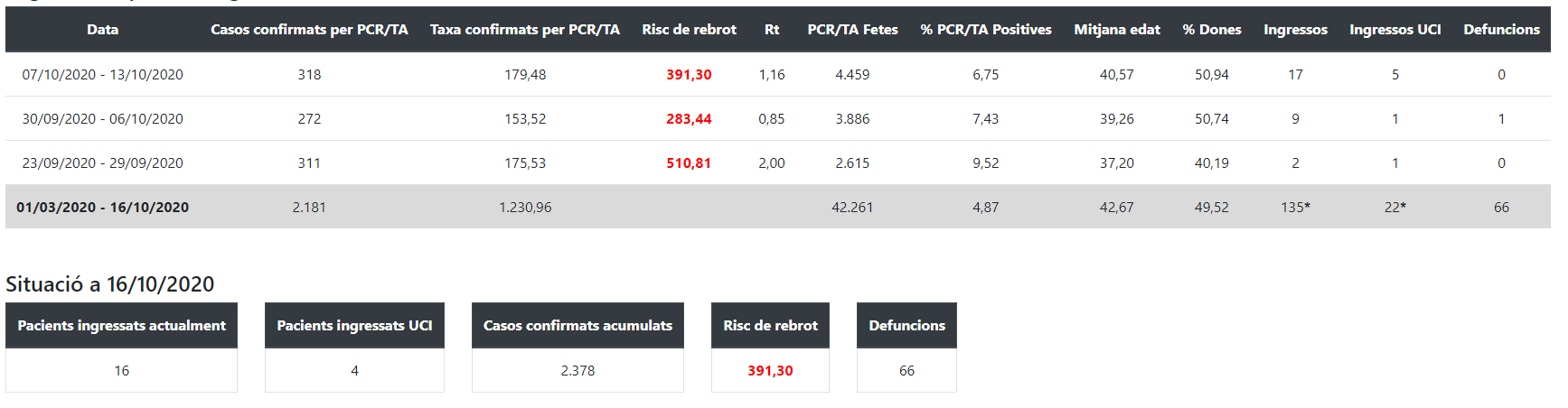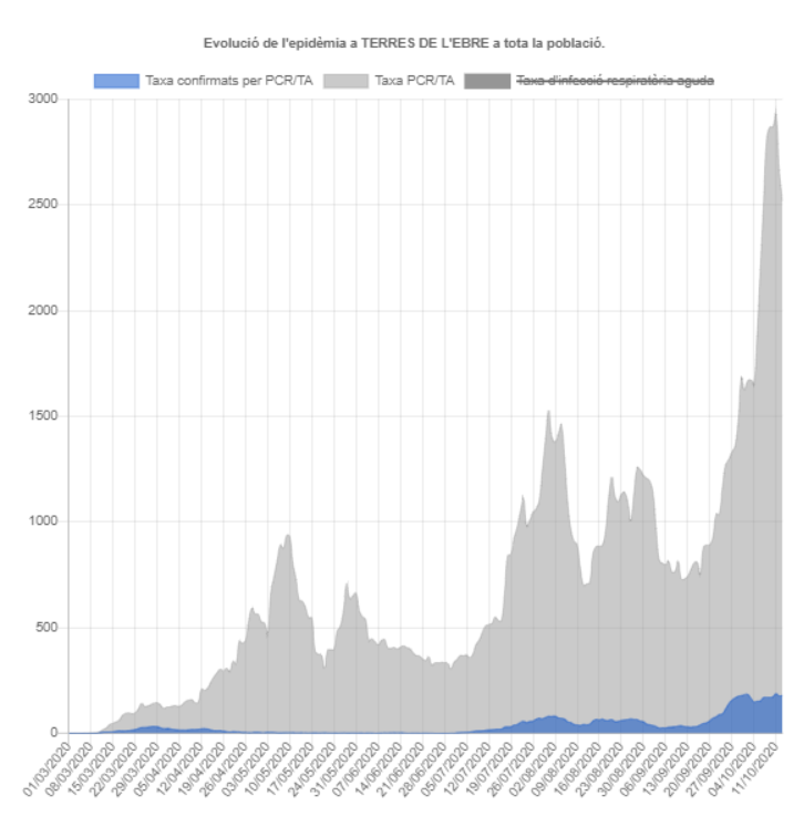 La regió sanitària de les Terres de l’Ebre acumula, des de l’inici de la pandèmia, 2.181 casos confirmats per PCR, 66 més que en el balanç anterior, i 2.378 si es tenen en compte la resta de proves. En aquesta regió han mort 66 persones, les mateixes que en l’últim balanç. El risc de rebrot augmenta 13,81 punts i ara és de 391,30. La setmana anterior era de 283,44. La taxa de confirmats per PCR en els darrers set dies és de 179,48 per cada 100.000 habitants. La taxa de reproducció del virus ni augmenta ni disminueix i es queda a 1,16, mentre que la setmana anterior era de 0,85. Segons l’últim balanç, hi ha 16 persones ingressades, una més que ahir, quatre de les quals a l’UCI, dos més.