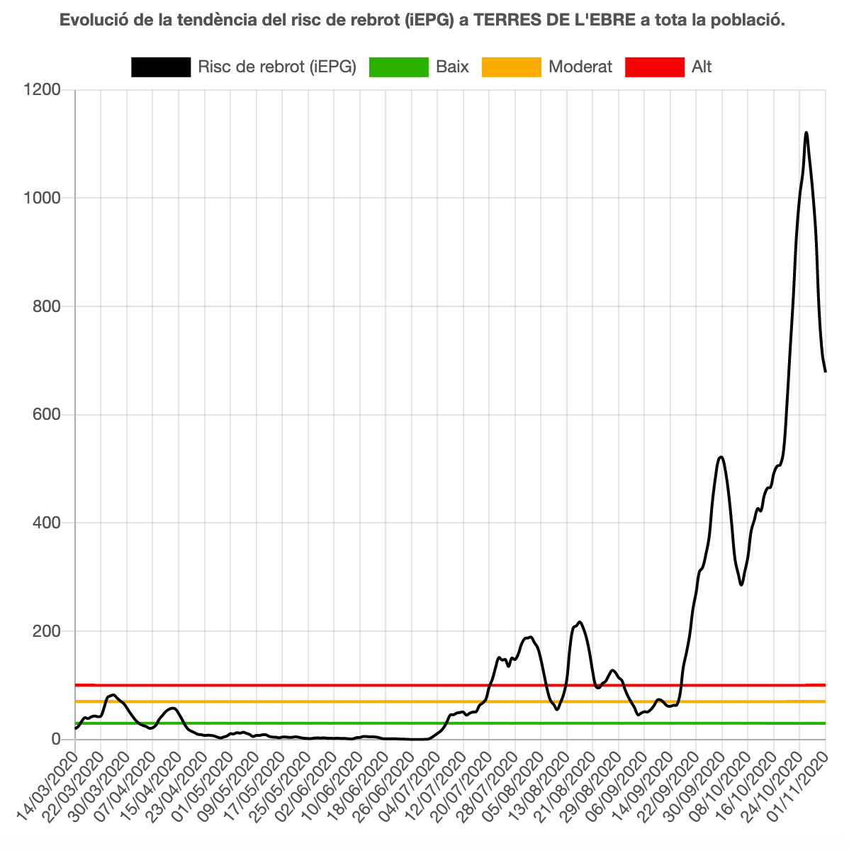 El risc de rebrot baixa 28 punts i se situa en 678 punts, per sota del de la setmana anterior, quan era de 1.049. Per altra banda, la taxa de confirmats per PCR o tests d’antígens entre el 26 d’octubre i l’1 de novembre és de 374,23 per cada 100.000 habitants. La incidència a 14 dies és de 828,81, pels 680,47 de la setmana anterior.