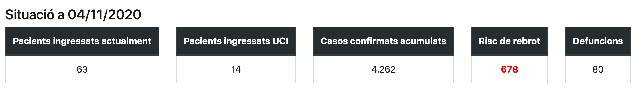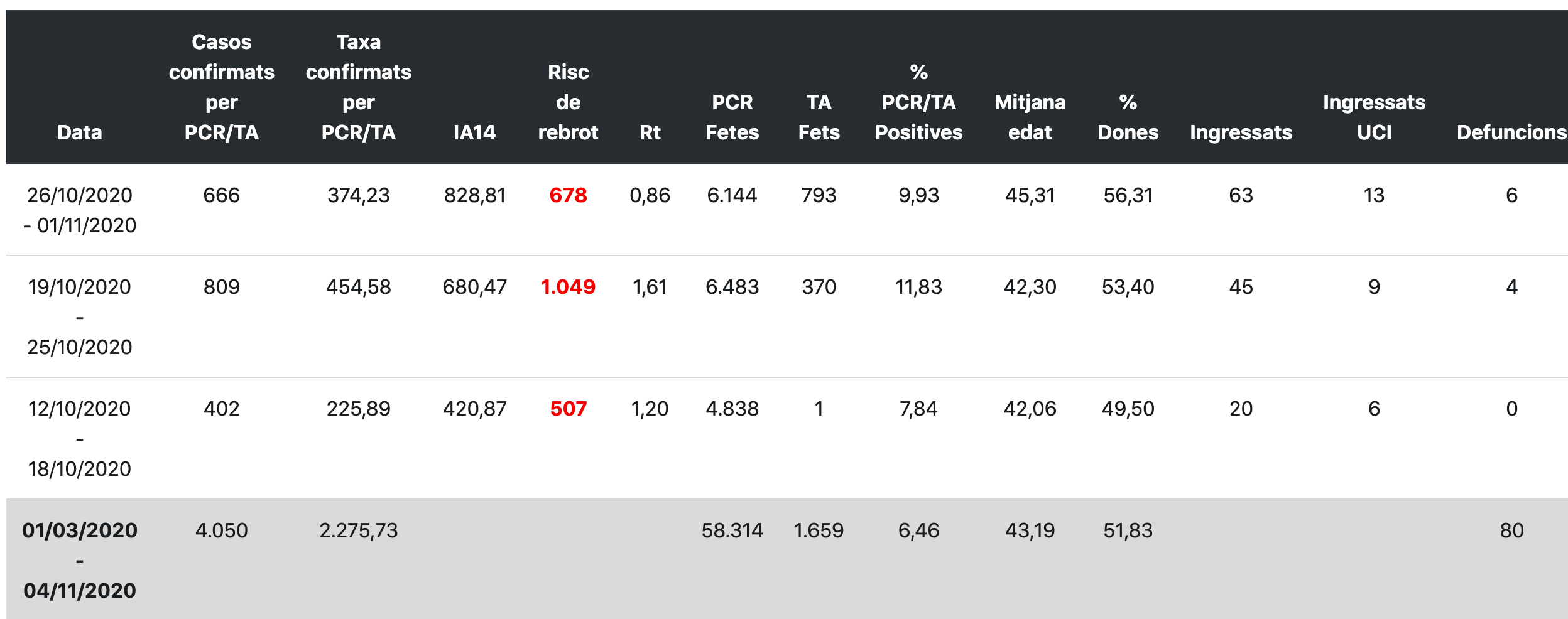 El risc de rebrot baixa 28 punts i se situa en 678 punts, per sota del de la setmana anterior, quan era de 1.049. Per altra banda, la taxa de confirmats per PCR o tests d’antígens entre el 26 d’octubre i l’1 de novembre és de 374,23 per cada 100.000 habitants. La incidència a 14 dies és de 828,81, pels 680,47 de la setmana anterior.