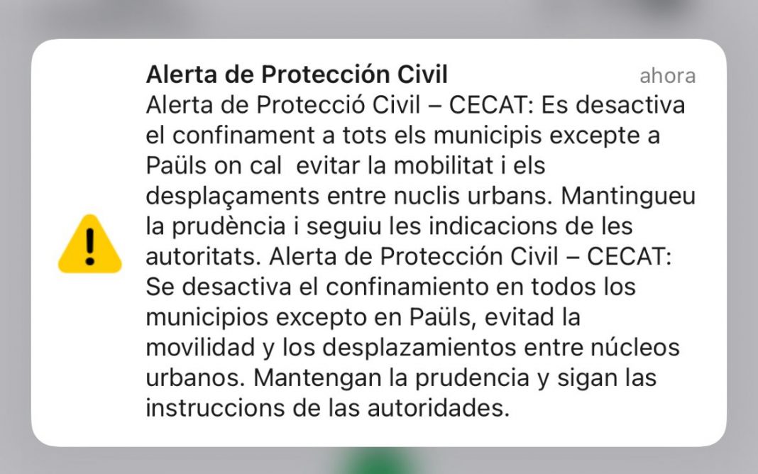 Protecció Civil ha enviat un missatge al mòbil a través del qual ha aixecat el confinament a tots els municipis afectats per l’incendi del Baix Ebre excepte a Paüls, on es demana “evitar la mobilitat i els desplaçaments entre nuclis urbans”. Estaven confinats Paüls, Xerta, Alfara de Carles, Aldover, Tivenys, Roquetes i els barris de Bítem, Jesús i els Reguers de Tortosa; mentre que a Pinell de Brai i Prat de Comte hi havia limitació de la mobilitat fora del nucli. Aquests confinaments afectaven unes 18.000 persones. Els Bombers tenen estabilitzat ja el 90% del perímetre i confien arribar a la totalitat al llarg del dia, segons ha indicat el cap de la intervenció, Joan Rovira, des del centre de comandament de Tortosa.