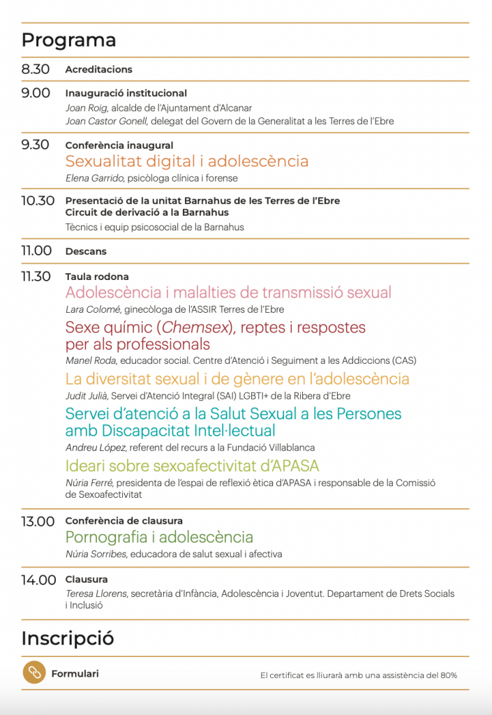 La jornada s’iniciarà amb la conferència inaugural “Sexualitat digital i adolescència”, a càrrec de la psicòloga clínica i forense Elena Garrido, qui tractarà la relació entre les noves tecnologies i la sexualitat juvenil. Posteriorment, es presentarà la unitat Barnahus de les Terres de l’Ebre, situada a Tortosa, que ofereix atenció integral a infants i adolescents víctimes de violència sexual, així com a les seves famílies.