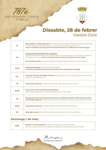 Un dels moments centrals arribarà a les 18.30 h amb la lectura de la Carta de Poblament d’Alcanar, amb acompanyament musical d’Àgueda Quiles i Víctor Moya. Tot seguit, a les 19.00 h, s’entregarà el premi de composició musical per a Banda de Música 787è Aniversari de la Carta Pobla d’Alcanar, amb la col·laboració de la Federació Catalana de Societats Musicals.