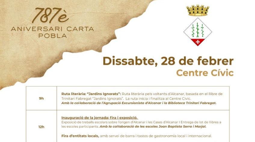 Alcanar commemorarà aquest dissabte 28 de febrer el 787è aniversari de la seva Carta Pobla amb una jornada festiva que combinarà història, cultura i música. El Centre Cívic acollirà una fira d’entitats locals i activitats per a tots els públics, en una iniciativa impulsada conjuntament per l’Ajuntament i el teixit associatiu del municipi.