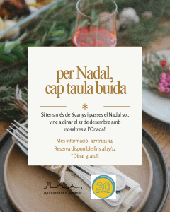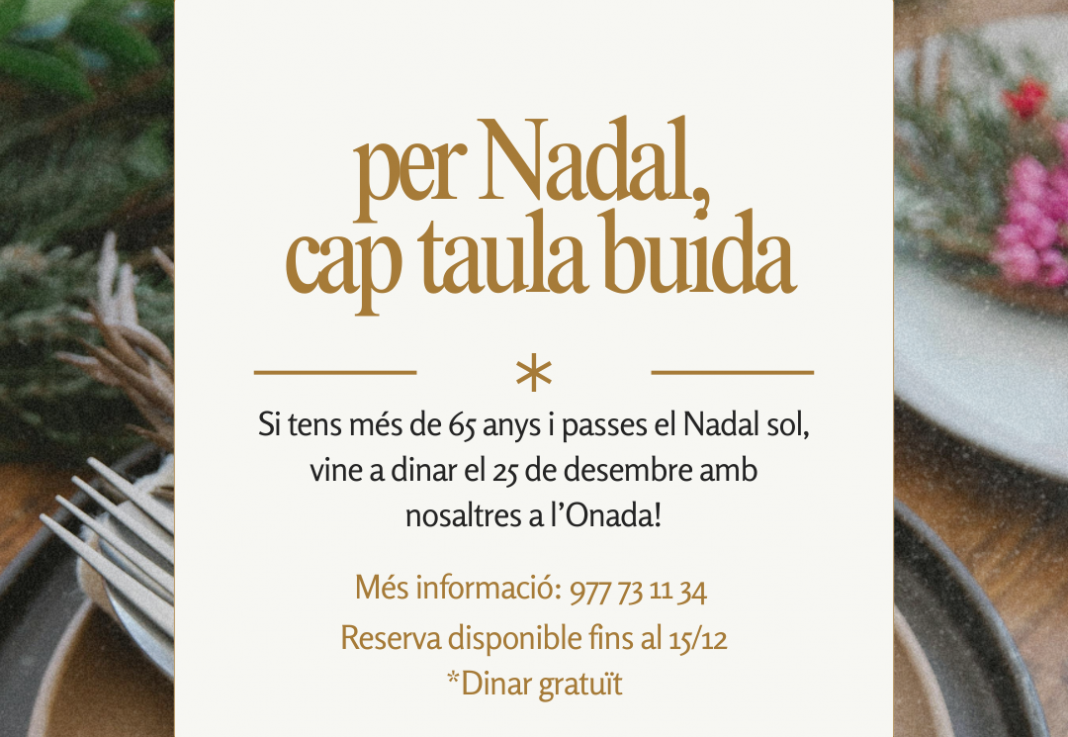 L’Ajuntament d’Alcanar ha posat en marxa la campanya solidària ‘Per Nadal, cap taula buida’, una iniciativa que vol garantir que cap persona major de 65 anys passi el dia de Nadal sola. Gràcies a l’acord entre la regidoria de Gent Gran, la d’Afers Socials i Famílies i l’Onada, aquelles persones que ho necessiten podran dinar de forma gratuïta al centre el pròxim 25 de desembre.