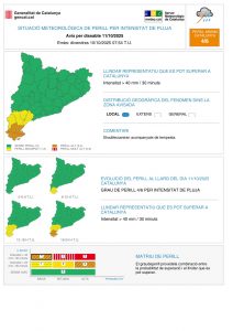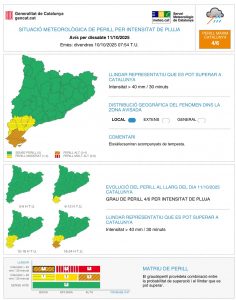 El Servei Meteorològic de Catalunya ha emès l’avís de situació meteorològica de perill per intensitat i acumulació de pluja de les 8.00 h del dissabte fins diumenge a les 20.00 h. El grau de perill màxim és de 4/6.