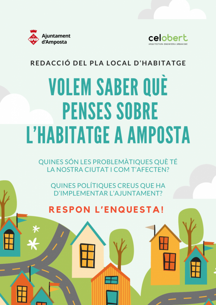 Definir les polítiques públiques en matèria d’habitatge per als propers sis anys. Aquest és el principal objectiu del Pla Local de l’Habitatge que actualment està redactant l’Ajuntament d’Amposta amb l’empresa Celobert, cooperativa d’arquitectura, enginyeria i urbanisme. Durant la primera fase, actualment en marxa, s’està fent un anàlisi de la situació de l’habitatge al municipi amb la participació dels equips tècnics municipals, les entitats i agents que treballen en l’habitatge a Amposta.