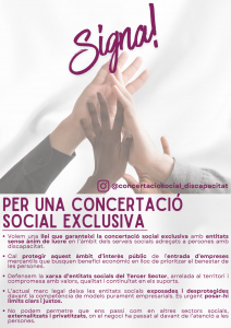 La iniciativa legislativa reclama l’aprovació d’una llei que asseguri que els serveis socials adreçats a persones amb discapacitat es concertin exclusivament amb entitats del tercer sector social, protegint així aquest àmbit d’interès públic de l’entrada d’empreses mercantils que prioritzen el benefici econòmic per davant del benestar de les persones.
