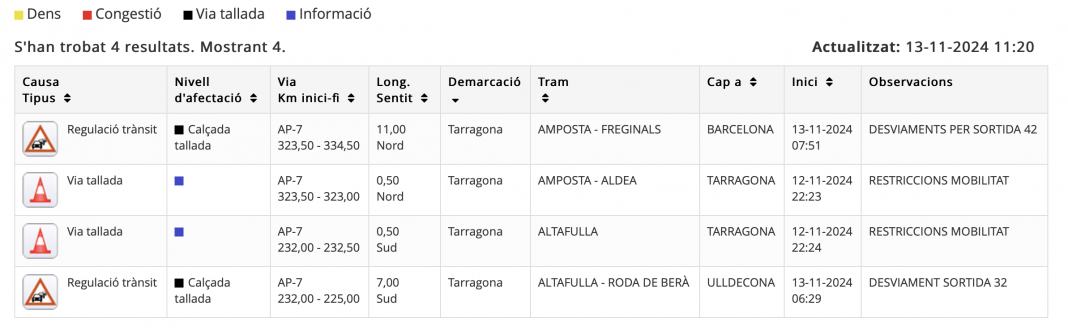 Trànsit ha informat que aquestes són les afectacions a les 11 del matí a les carreteres de les Terres de l’Ebre i el Camp de Tarragona: