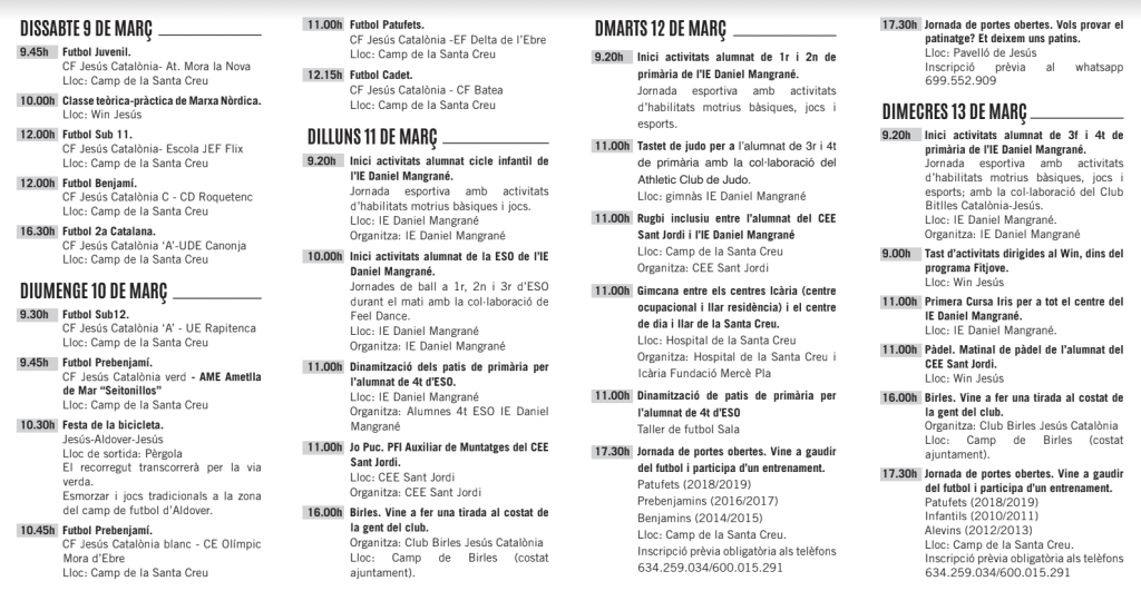 L’EMD de Jesús ha organitzat per novè any consecutiu, una nova edició de la Setmana de l’Activitat Física i la Salut. L’Ajuntament juntament amb entitats, i clubs del poble vinculats al món de l’esport i l’Institut-Escola Daniel Mangrané, CEE Sant Jordi, i el Centre Icària han programat una cinquantena d’activitats vinculades al món de l’esport i la salut entre els dies 9 i 16 de març. Totes elles adaptades a tots els nivells i sempre acompanyades, i guiades en tot moment, pels membres de les entitats organitzadores.