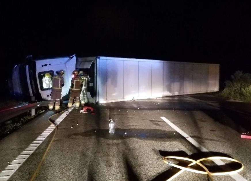 Un camió de gran tonatge carregat de verdures va bolcar anit a l’AP-7 a l’Ametlla de Mar (Baix Ebre) i va deixar el conductor ferit lleu, segons han informat els Bombers de la Generalitat. L’avís de l’accident es va rebre a les 22:45 hores al quilòmetre 295,5. El tràiler viatjava en direcció nord però –com a conseqüència del sinistre- va saltar la mitjana i va quedar tombat en direcció sud, cap al País Valencià, obstaculitzant totalment el pas de vehicles. Més de 15 hores després, l’AP-7 encara es troba tallada en sentit sud en aquest punt a l’espera que es pugui retirar el camió accidentat. Trànsit detalla que es fan desviaments en un tram de 16 quilòmetres per la veïna A-7/N-340 a través de la sortida de l’Hospitalet de l’Infant.