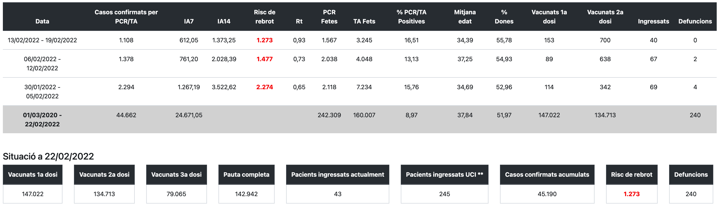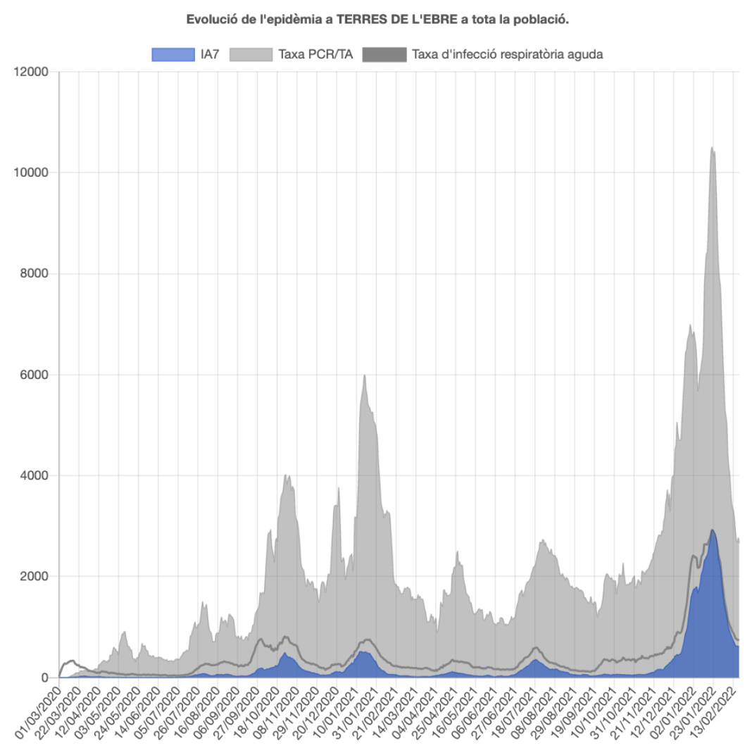 Segons dadescovid.cat, actualment hi ha 51 persones ingressades per Covid-19, 8 de les quals a l’UCI, i son un 35% menys que fa dues setmanes, ja que el dia 9 de febrer hi havia 78 ingressats (15 a l’UCI). A les Terres de l’Ebre han mort 240 persones des de l’inici de la pandèmia, cap més. Les últimes defuncions daten del 6 i el 9 de febrer. La incidència a 7 dies és de 612 i a 14 dies és de 1.373. El 16,51% de les proves que es fan donen positiu.