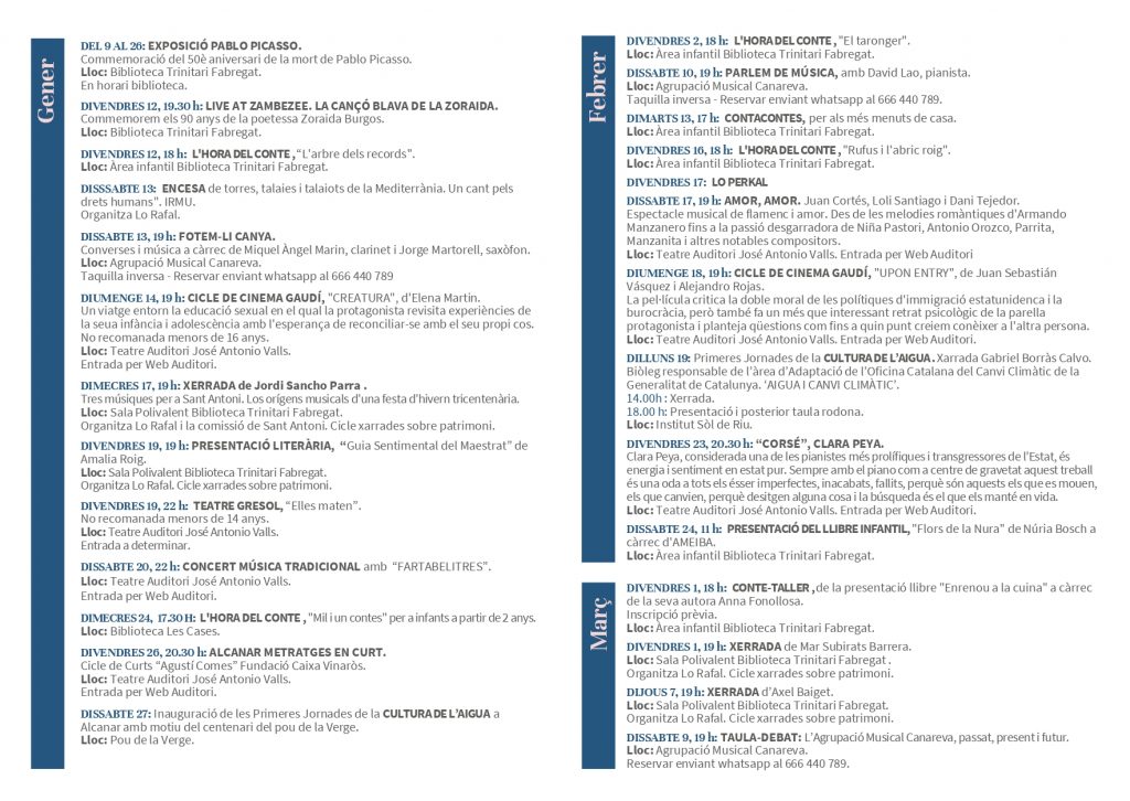L’agenda començarà el dimarts 9 de gener amb l’exposició Pablo Picasso, en motiu de la commemoració del 50è aniversari de la seva mort. Contacontes a la Biblioteca Trinitari Fabregat, espectacles teatrals amb “Jo, Travesti”, concerts tradicionals amb “Fartabelitres” o propostes de dansa amb “Amor Amor”, també formaran part de l’extensa programació que s’ha preparat.