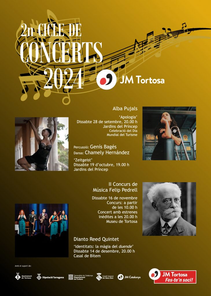 El primer concert serà el pròxim 28 de setembre a les 20:00 h, als Jardins del Príncep, amb el quintet de jazz, APOLOGIA: Alba Pujals al trombó, saxo, piano contrabaix i bateria.