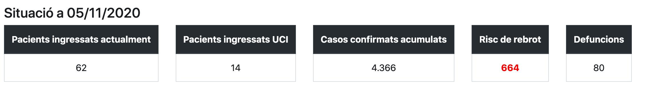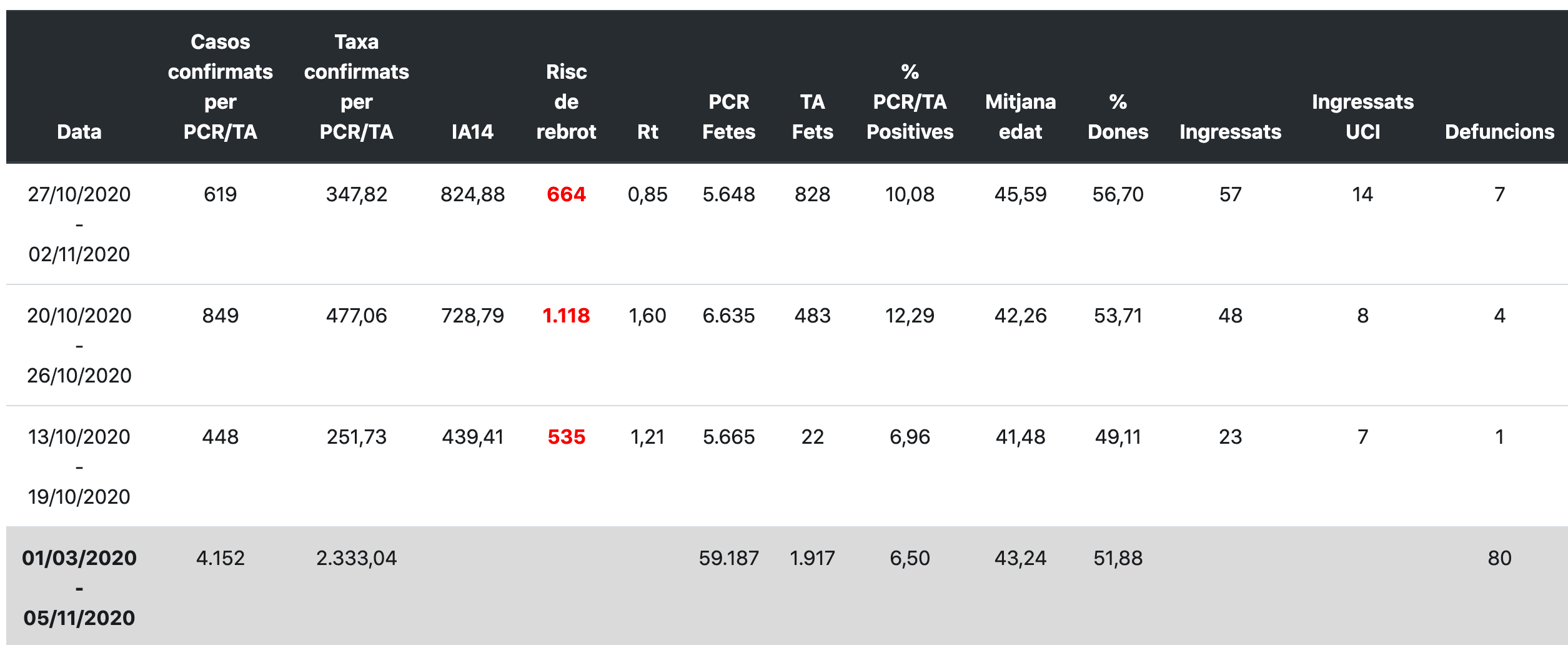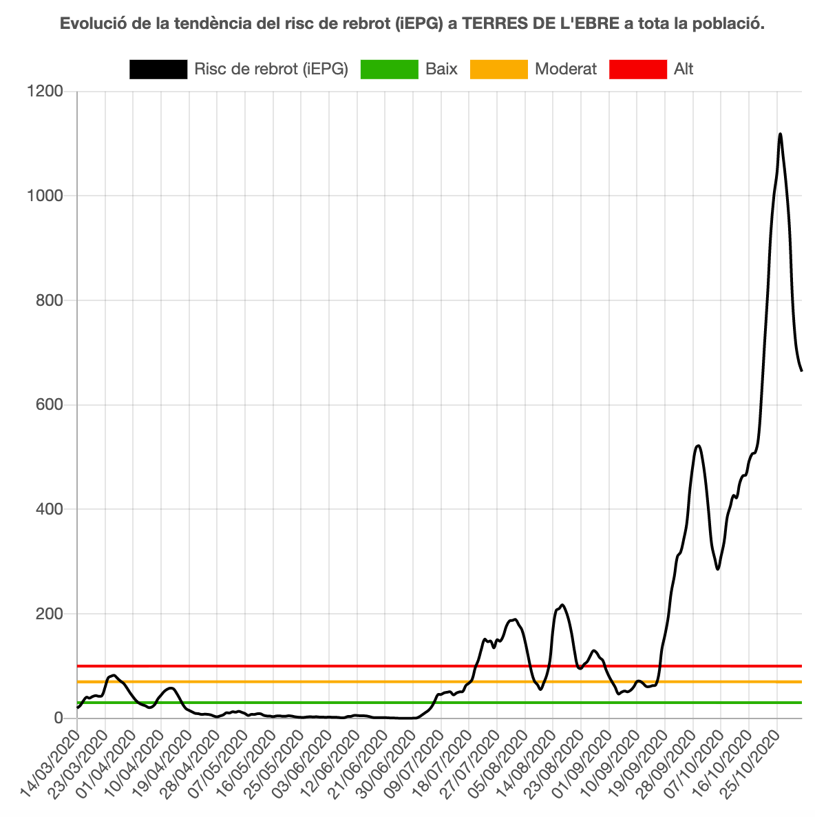 El risc de rebrot baixa 14 punts i se situa en 664 punts, per sota del de la setmana anterior, quan era de 1.118. Per altra banda, la taxa de confirmats per PCR o tests d’antígens entre el 27 d’octubre i el 2 de novembre és de 347,82 per cada 100.000 habitants. La incidència a 14 dies és de 824,88, pels 728,79 de la setmana anterior.
