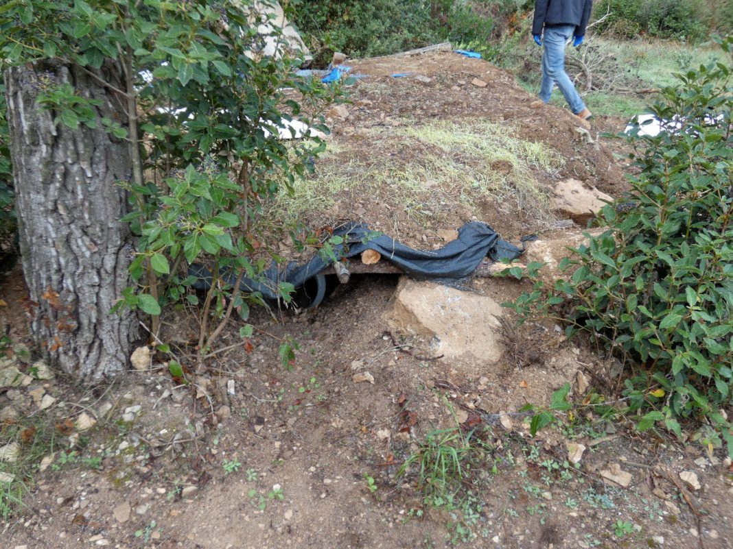 En l’operatiu policial, els Mossos van localitzar diversos forats fets a terra d’un metre i mig de profunditat, que tenien un sistema de ventilació a través d’uns tubs de ferro. A dins dels amagatalls hi havia sacs de plàstic amb 370 quilos de cabdells de marihuana envasats al buit. Els forats estaven soterrats i coberts a la superfície amb tendals de plàstic, terra i troncs de fusta, perquè no fossin vistos tampoc en inspeccions per l’aire.