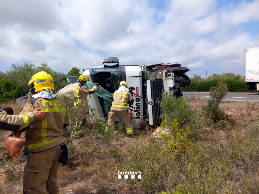 Dues persones han resultat ferides menys greus en bolcar un camió a l’AP-7, a l’altura de Camarles. Els fets han tingut lloc a les 12:39 hores d’aquest dissabte al punt quilomètric 314 de la carretera en sentit sud. Segons informa el Servei Català de Trànsit, un camió que transportava material per a concerts ha punxat una roda i ha sortit de la via. Els dos ferits menys greus han estat traslladats a l’hospital Verge de la Cinta de Tortosa, mentre que dues persones més han estat ateses pel Sistema d’Emergències Mèdiques i han estat donades d’alta in situ. A causa de l’incident, hi ha hagut un vessament de gasoil que ja ha estat controlat.