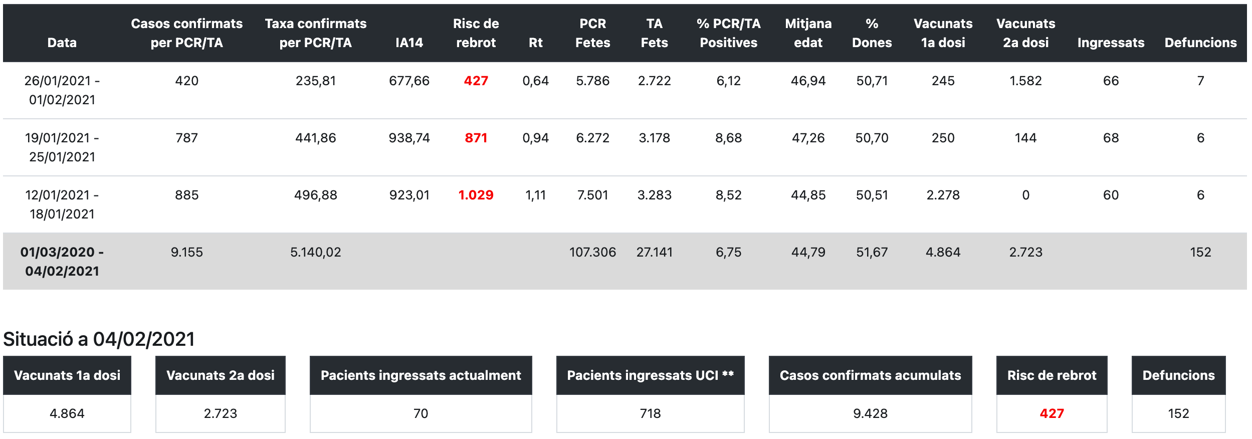 La taxa de confirmats per PCR o tests d’antígens entre el 26 de gener i l’1 de febrer és de 420 per cada 100.000 habitants. El 6,12% de les proves de la darrera setmana han donat positiu. D’altra banda, hi ha hagut dues noves morts i el total és de 152. Els vacunats de la primera dosi arriben a 4.864, 94 més, i a 2.723 els vacunats de la segona dosi, 581 més.