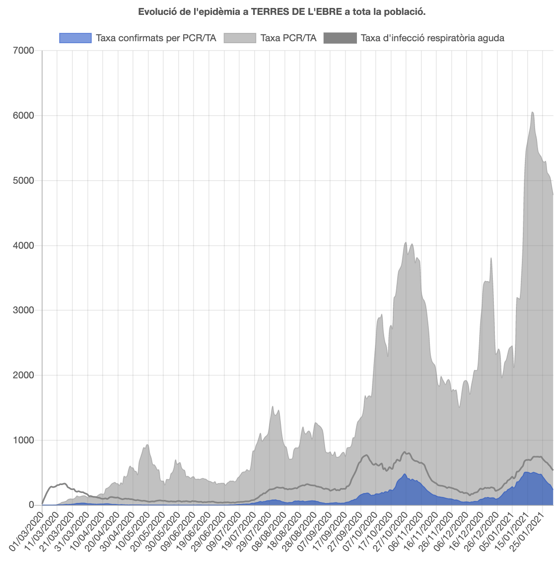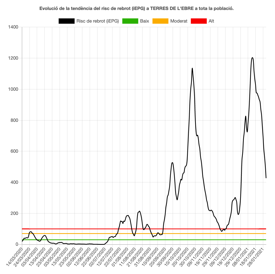 La velocitat de propagació de la Covid-19, l’Rt, baixa a 0,64 a les Terres de l’Ebre, cinc centèsimes menys que fa 24 hores i el risc de rebrot també baixa i ho fa 78 punts fins als 427. La incidència a 14 dies baixa i passa de 751 a 678. S’han declarat 52 nous casos confirmats per PCR o tests d’antígens, cosa que eleva la xifra total a 9.155, 9.428 si es tenen en compte la resta de proves.