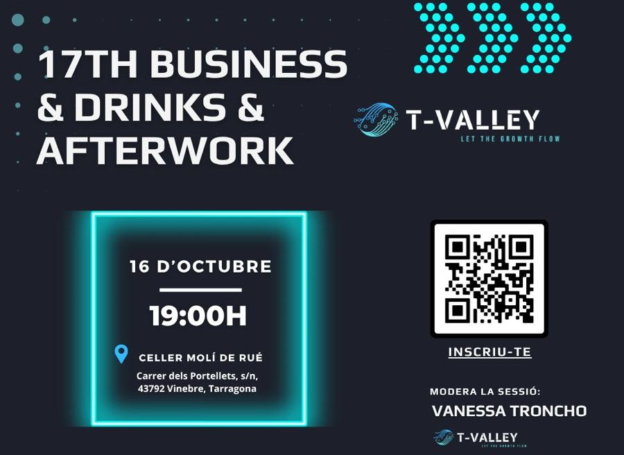 El proper 16 d’octubre a les 19h, el Celler Molí de Rué (Carrer dels Portalets, s/n de Vinebre) acollirà una nova edició del Business & Drinks & Afterwork organitzat per T-Valley, que celebra ja la seva 17a edició, consolidant-se com una trobada de referència per al teixit empresarial i innovador del territori.