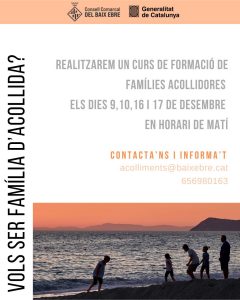 El Consell Comarcal del Baix Ebre, amb el suport de la Generalitat de Catalunya, realitzarà un curs de formació adreçat a persones i famílies interessades a convertir-se en famílies acollidores. Les sessions es duran a terme els dies 9, 10, 16 i 17 de desembre, en horari de matí, i tenen per objectiu oferir eines, orientació i acompanyament a tots aquells que volen obrir les portes a infants que, per motius diversos, no poden viure temporalment amb la seva família d’origen.
