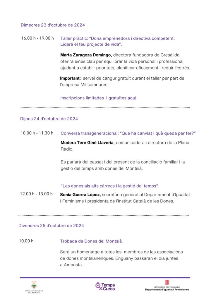 Entre les activitats més destacades, es comptarà amb la ponència de Sònia Guerra López, secretària general d’Igualtat i Feminisme i presidenta de l’Institut Català de les Dones. Guerra abordarà els reptes actuals del mercat laboral i les experiències de les dones en llocs de responsabilitat, oferint també una visió personal sobre la seva trajectòria.