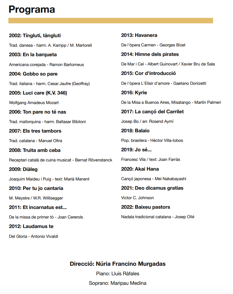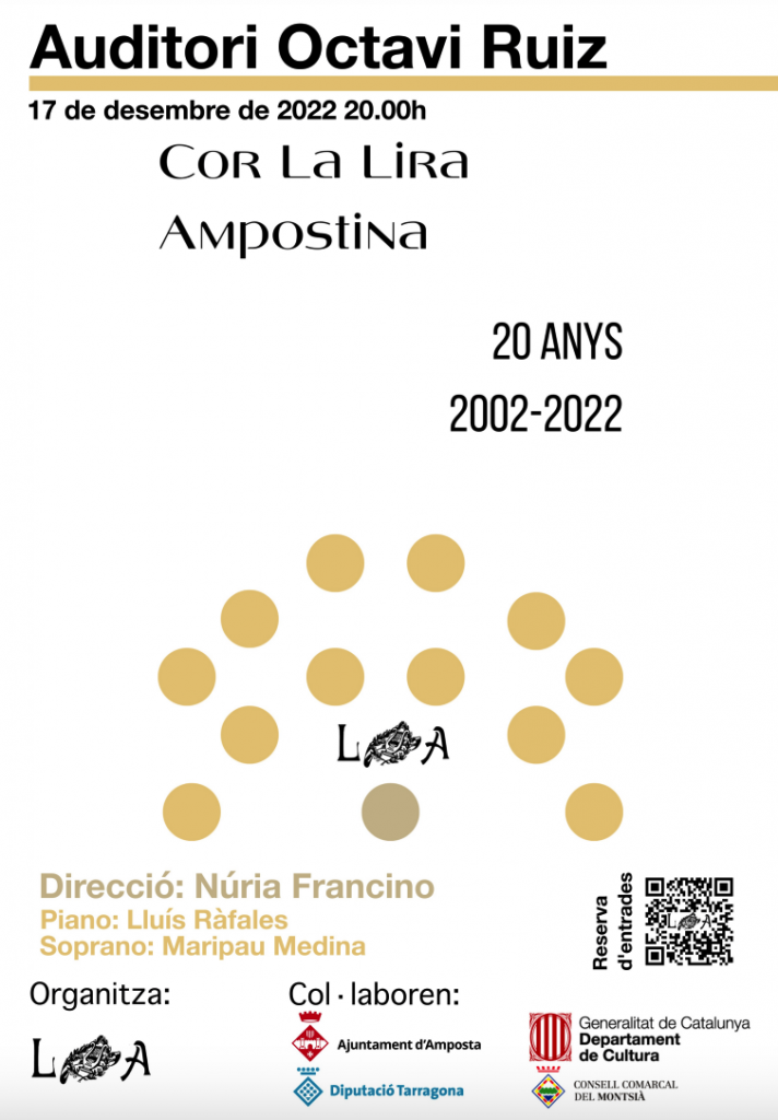 Dissabte, 17 de desembre, a les vuit del vespre a l’Auditori Octavi Ruiz de La Lira Ampostina, se celebrarà el concert que clourà el 20è aniversari del cor La Lira Ampostina. El concert és un viatge pels 20 anys d’història de la formació, amb obres significatives de cada un dels anys, una mostra de la trajectòria del cor i de les vivències de les i dels seus cantaires. Ben segur que serà un concert magnífic i emotiu.
