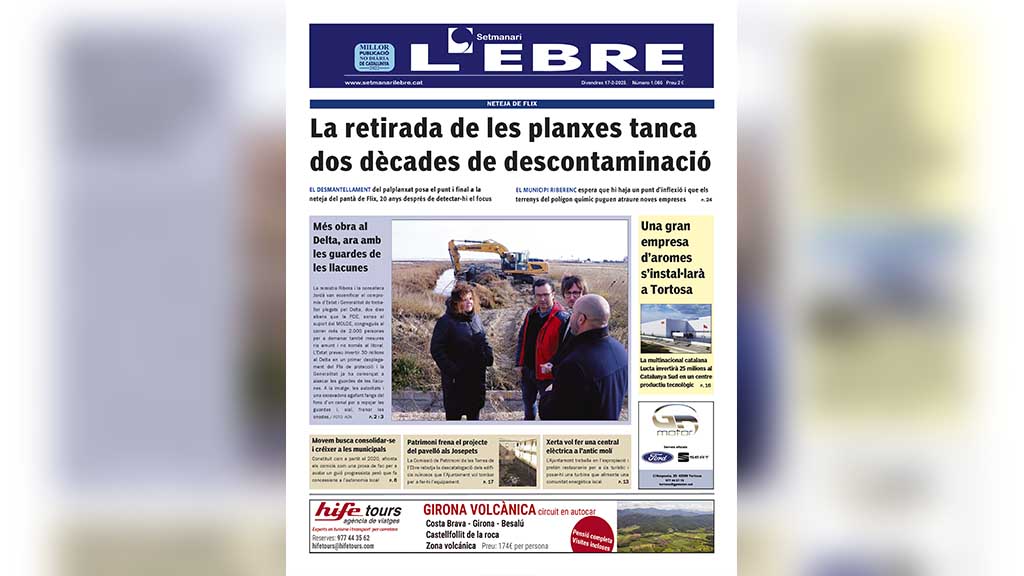L’edició en paper número 1066 del Setmanari L’EBRE dedica el titular de portada al punt i final definitiu a la neteja del pantà de Flix, dos dècades després que s’hi detectés un greu focus de contaminació química a la llera del riu. Els treballs s’han concentrat en l’última dècada i el municipi confia ara, ja sense el palplanxat de seguretat que s’havia instal·lat per a la descontaminació, girar full i que el polígon químic puga atraure noves inversions.