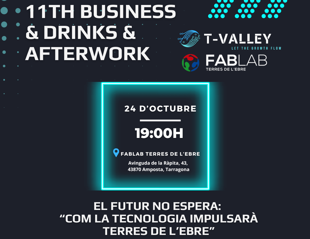 El Fab-lab de les Terres de l’Ebre acollirà el proper 24 d’octubre a les 19:00 h el 11è Business & Drinks organitzat per T-Valley, on es posarà sobre la taula com la tecnologia transformarà la vida quotidiana a les Terres de l’Ebre. Fundadors de T-Valley, Vanessa Troncho i Jordi Andreu, conduiran una conversa que abordarà preguntes fonamentals sobre el futur: com seran les nostres cases, quina energia les alimentarà i quins materials s’utilitzaran en la seva construcció?