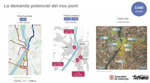 D’acord amb els estudis preliminars efectuats per Territori, uns 3.000 vehicles diaris podrien fer servir la nova infraestructura. La idea, sobre el paper, és poder descongestionar el trànsit de vehicles pels dos ponts -el de l’Estat i el del Mil·lenari-, repartint-lo pels diferents eixos i millorant la connectivitat de la zona nord. Un 40% del trànsit que actualment circula per la T-301 el faria servir, calculen.