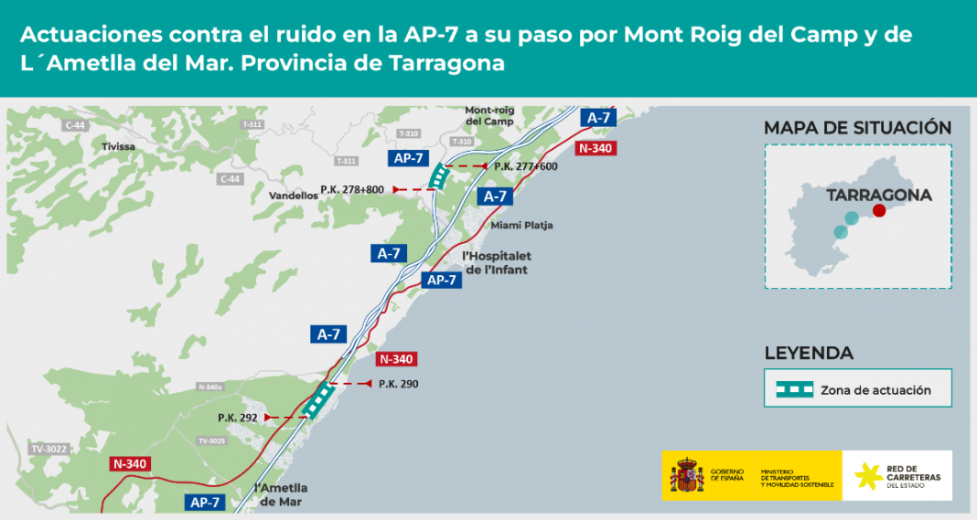 El Ministeri de Transports i Mobilitat Sostenible ha aprovat el projecte de construcció d’actuacions per reduir el soroll a l’Ap-7 al pas pels termes municipals de Mont Roig del Camp (km 277,6 al 278,8) i de l’Ametlla de Mar (km 290 al 292). Les obres tenen un pressupost estimat de 10,2 milions d’euros (IVA inclòs). A partir d’anàlisis prèvies, s’han definit en aquest projecte les accions a desenvolupar als trams abans esmentats per la presència de nombrosos nuclis de població, edificacions aïllades i un centre docent. D’aquesta manera, s’ha conclòs com a solució als problemes acústics a l’àmbit del projecte, la instal·lació d’un total de 2.883 m pantalles acústiques al marge esquerre de l’autopista en dos trams.