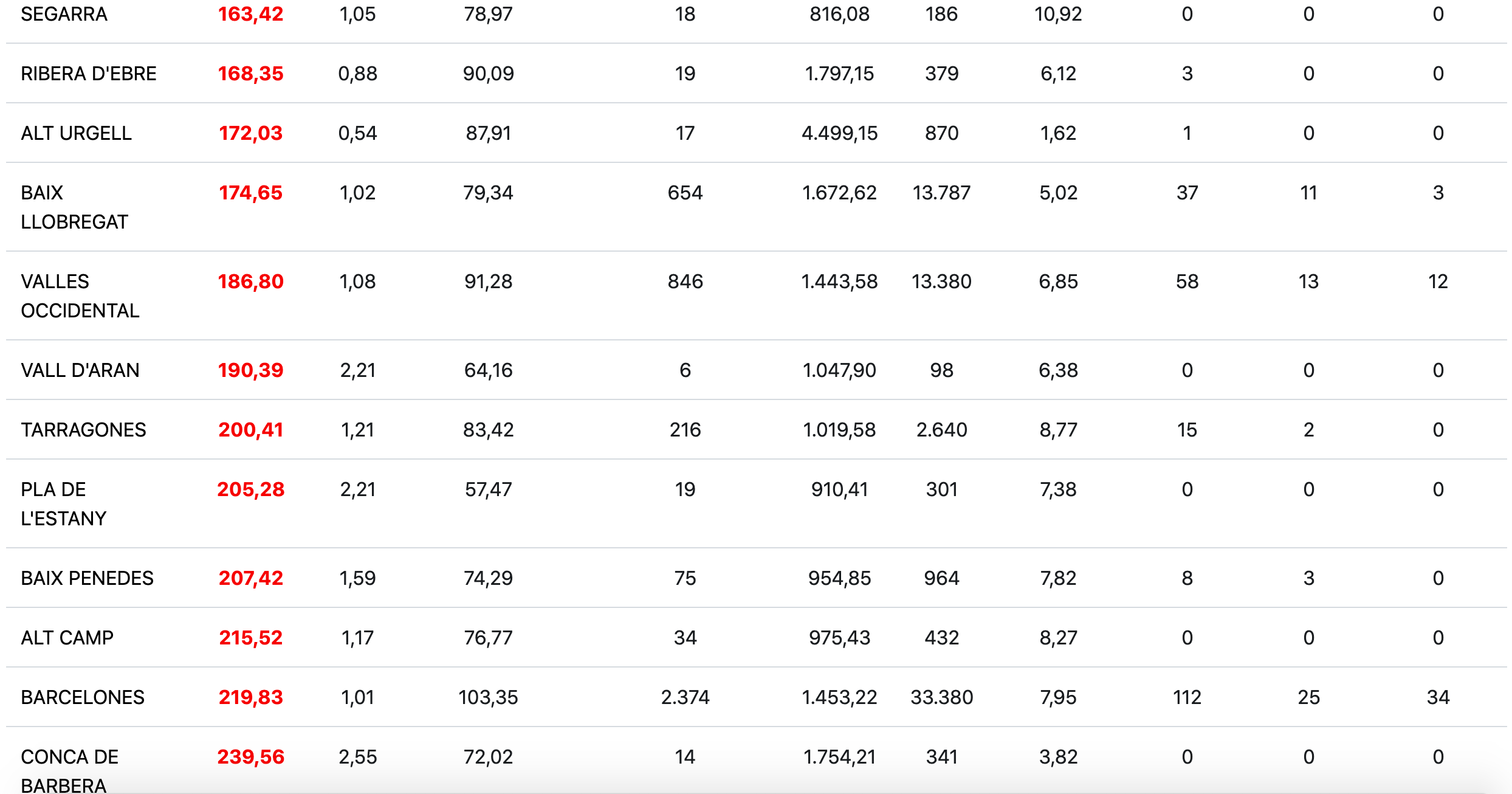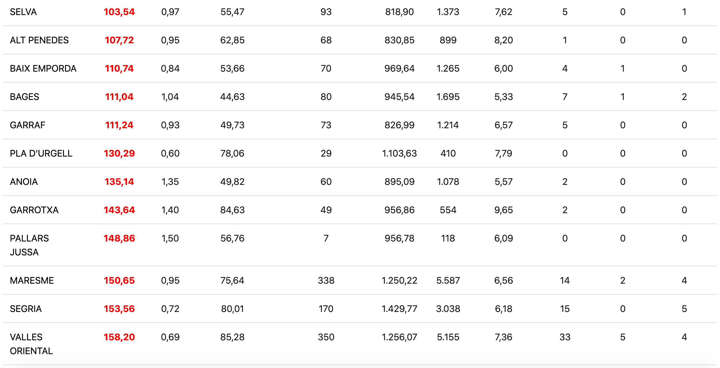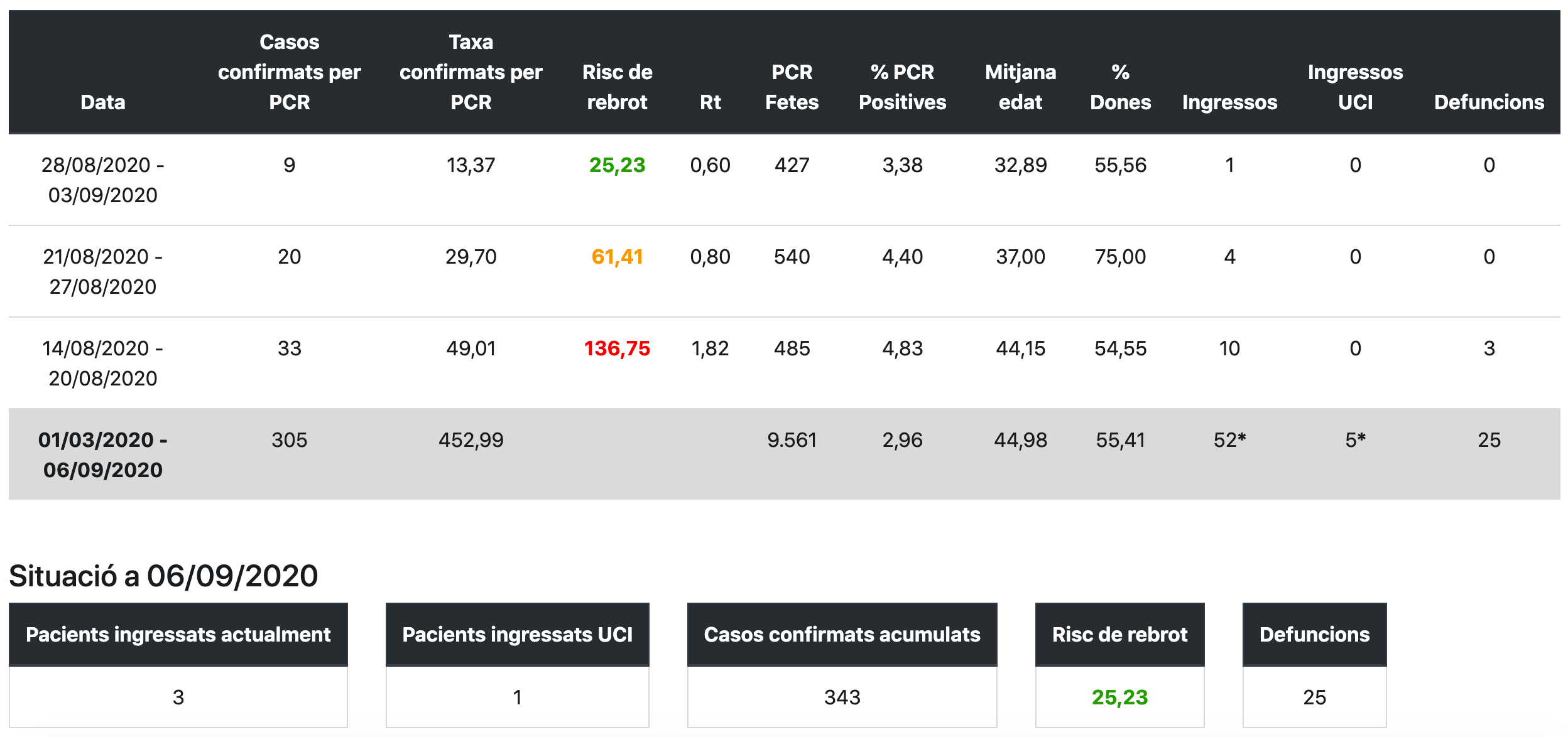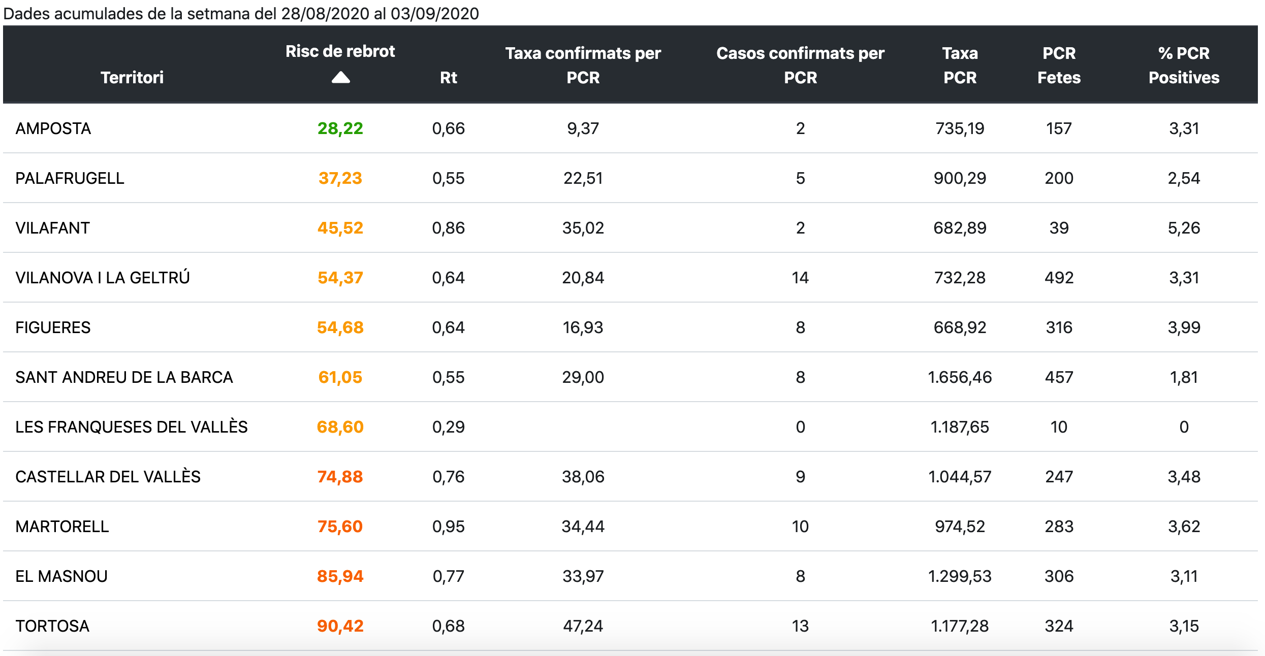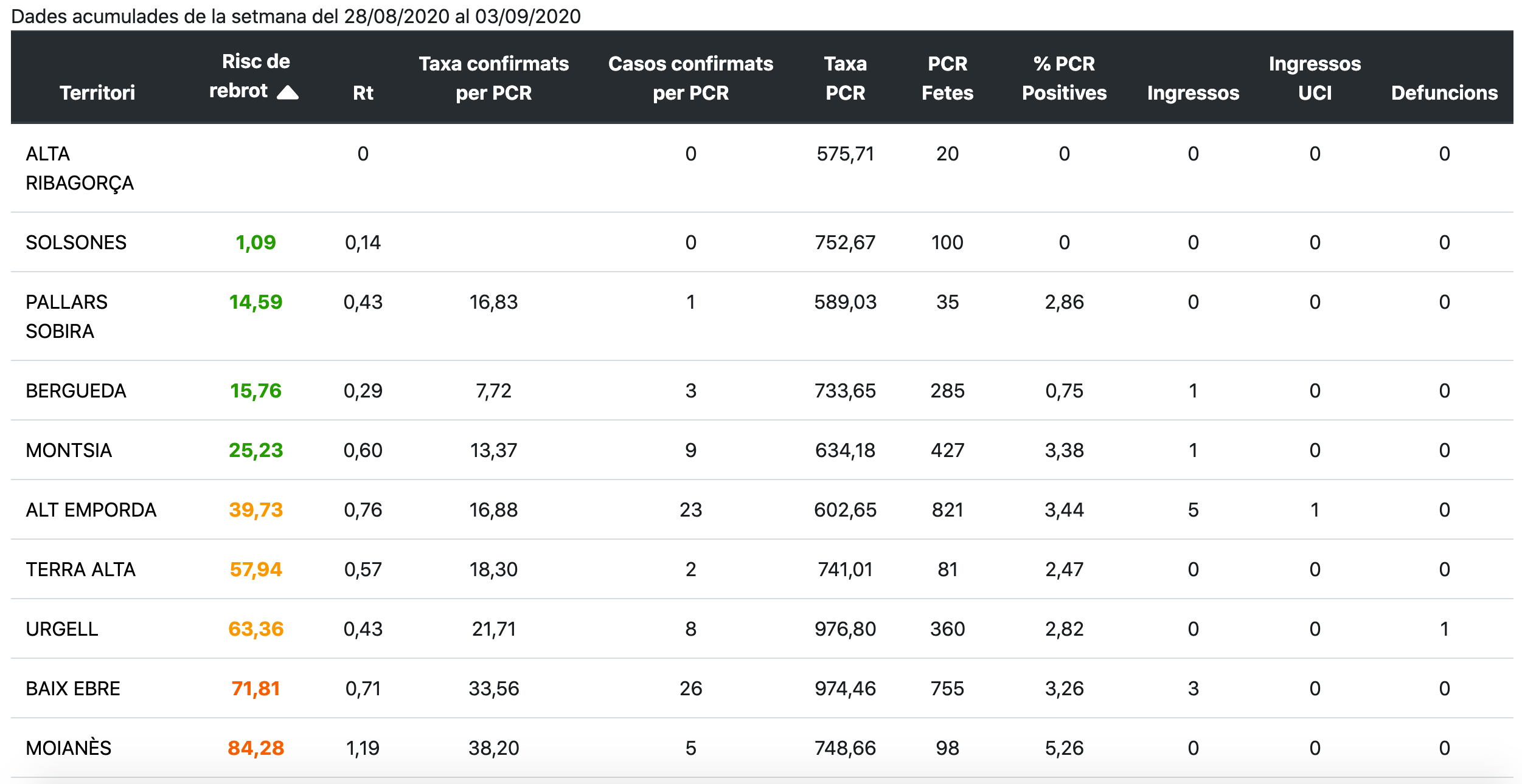 A continuació podeu comprovar les dades comarcals de l’última setmana. El Montsià se situa en la cinquena posició tenint en compte el risc de rebrot.