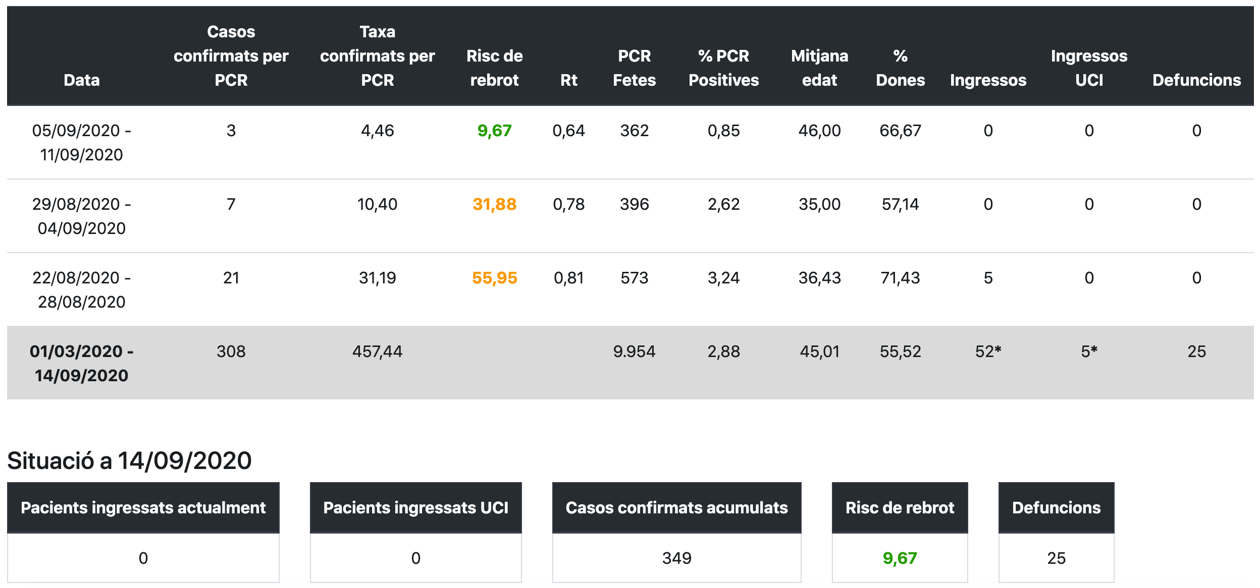 El Montsià acumula, des de l’inici de la pandèmia, 349 casos confirmats per PCR, cap més respecte al balanç anterior, i 308 si es tenen en compte la resta de proves. En aquesta comarca han mort 25 persones. El risc de rebrot té una tendència a la baixa des del passat 17 d’agost, actualment és de 9,67. Per altra banda, la taxa de confirmats per PCR en els darrers set dies és de 4,46 per 100.000 habitants, mentre que l’Rt, és a dir, la velocitat de reproducció del virus és de 0,64. Segons aquest últim balanç no hi ha cap persona ingressada a l’hospital.