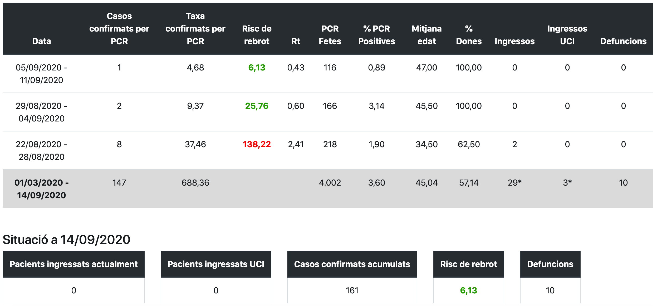 Amposta acumula, des de l’inici de la pandèmia, 147 casos confirmats per PCR, cap més respecte al balanç anterior, i 161 si es tenen en compte la resta de proves. En aquesta ciutat han mort 10 persones. El risc de rebrot té una tendència a la baixa des del passat 27 d’agost, actualment és de 6,13. Per altra banda, la taxa de confirmats per PCR en els darrers set dies és de 4,68 per 100.000 habitants, mentre que l’Rt, és a dir, la velocitat de reproducció del virus és de 0,43. Segons aquest últim balanç no hi ha cap persona ingressada a l’hospital.