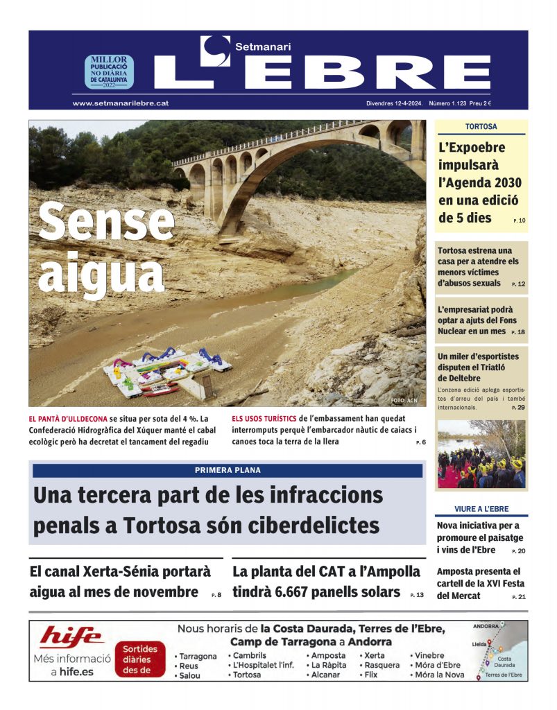 El protagonisme de la portada de l’edició en paper del Setmanari l’Ebre se l’endú una fotografia de l’embassament d’Ulldecona sense aigua. La Confederació Hidrogràfica del Xúquer manté el cabal ecològic però no permet els usos per al regadiu. Els fets delictius comesos a Tortosa i Amposta durant el 2023 és el tema que ocupa la primera plana. A la portada es destaca que una tercera part de les infraccions penals comeses a Tortosa són ciberdelictes. A la capital del Baix Ebre els delictes van augmentar en un 15 per cent el 2023 mentre que a Amposta ho van fer en un 34 per cent.