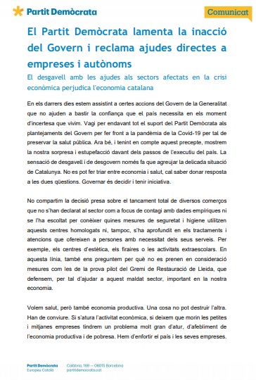 El Partit Demòcrata ha emès un comunicat en el qual lamenten la inacció del Govern i expressen que no comparteixen la decisió presa sobre el tancament total de diversos comerços que no s’han declarat al sector com a focus de contagi.