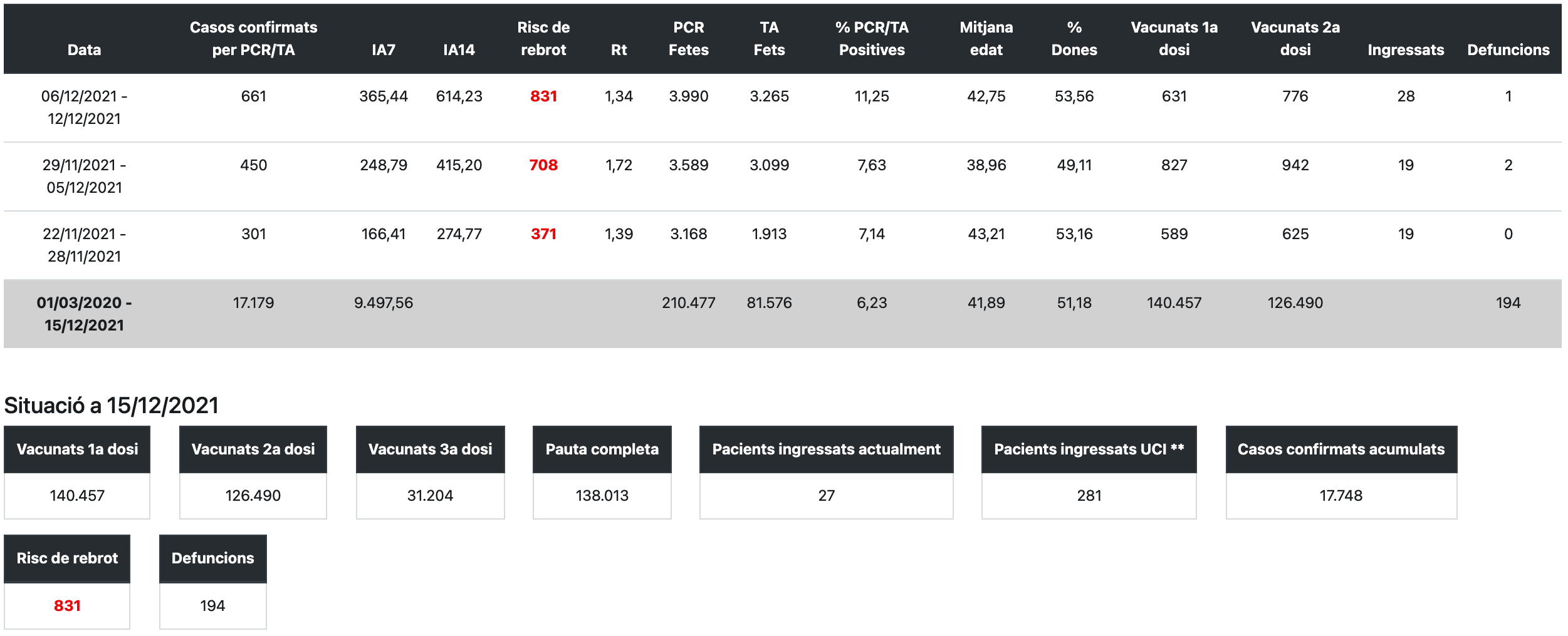 Segons dadescovid.cat, actualment hi ha 35 persones ingressades per Covid-19, una menys, 8 de les quals a l’UCI. A les Terres de l’Ebre han mort 194 persones des de l’inici de la pandèmia, cap més. Les dues últimes defuncions daten del 5 i de l’11 de desembre. La incidència a 7 dies és de 365 i a 14 dies és de 614. L’11,25% de les proves que es fan donen positiu.