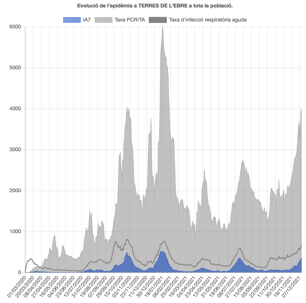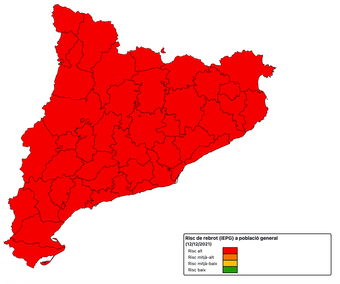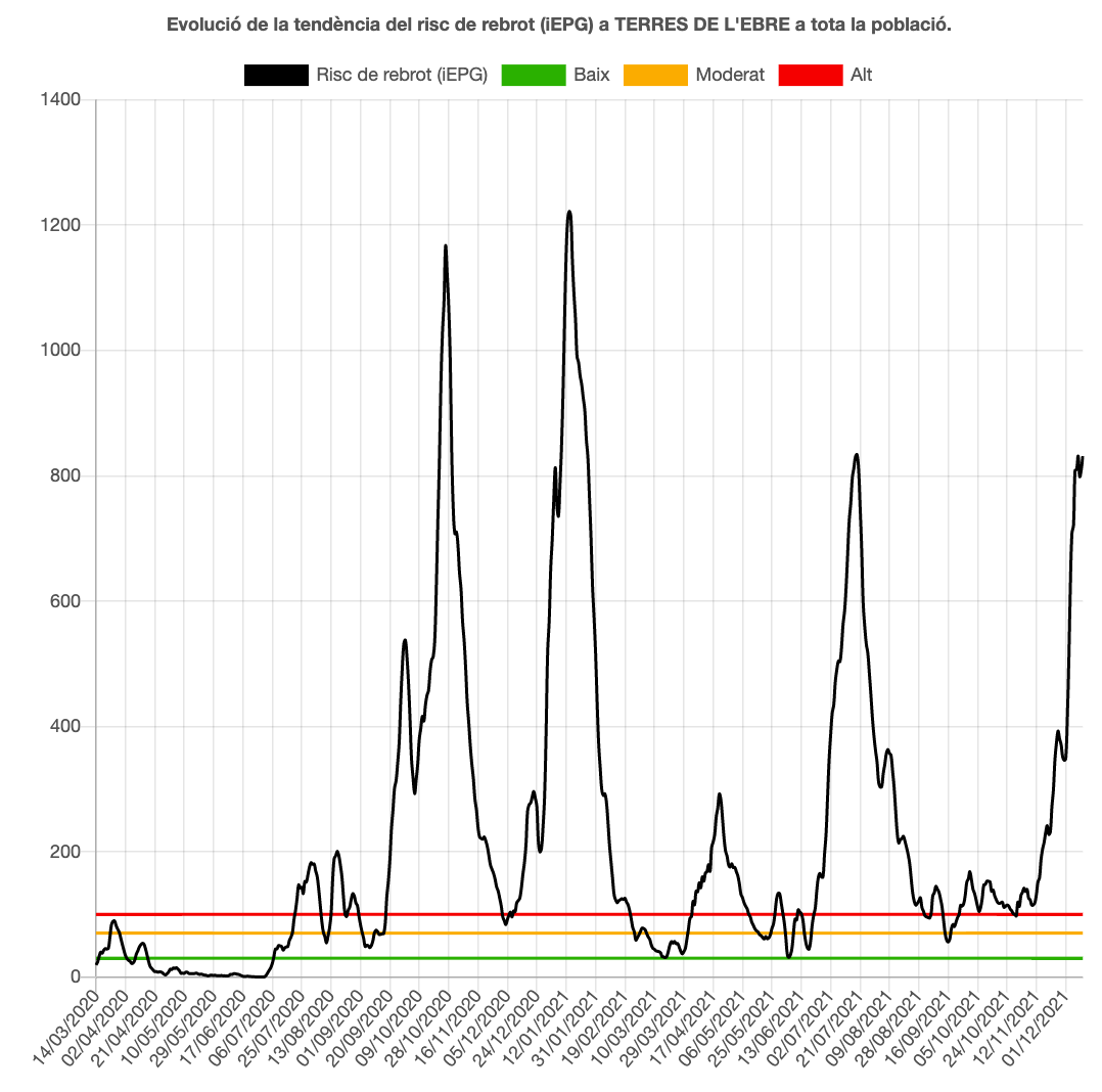 La pandèmia segueix a l’alça, ja que la velocitat de contagi (Rt) supera l’1, però baixa una centèsima respecte ahir fins a 1,34. El risc de rebrot puja i ho fa 48 punts fins a 831, risc molt alt, i se situa a nivells del 19 de juliol, quan es va assolir el pic de l’anterior onada. Per tant, sembla que aquesta onada superarà l’anterior. Tenen un risc molt alt les quatre comarques, la Ribera d’Ebre de 525, el Montsià de 934, la Terra Alta de 1.173 i el Baix Ebre de 835.