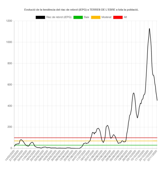 El risc de rebrot baixa 44 punts i se situa en 450 punts, per sota del de la setmana anterior, quan era de 689. Per altra banda, la taxa de confirmats per PCR o tests d’antígens entre el 2 i el 8 de novembre és de 257,35 per cada 100.000 habitants. La incidència a 14 dies és de 639,45, pels 838,37 de la setmana anterior.