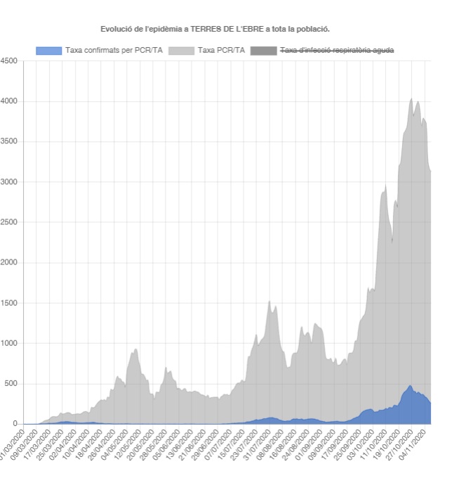 La regió sanitària de les Terres de l’Ebre acumula, des de l’inici de la pandèmia, 4.518 casos confirmats per PCR o antígens (42 més que en el balanç anterior), 4.734 si es tenen en compte la resta de proves. En aquesta regió han mort 92 persones, sis més que en el balanç anterior. Entre el 2 i el 8 de novembre es van notificar 11 defuncions, 6 en l’interval anterior.