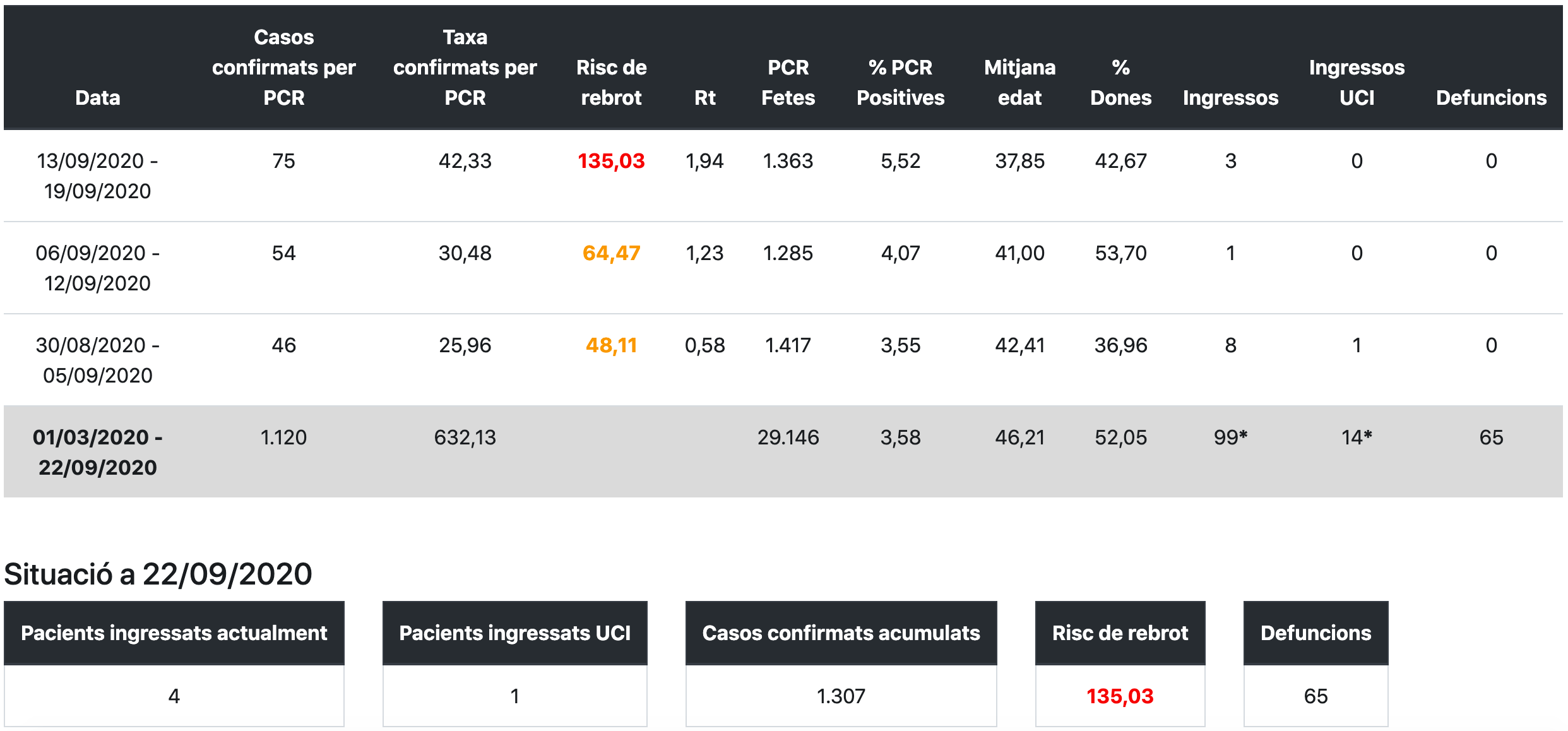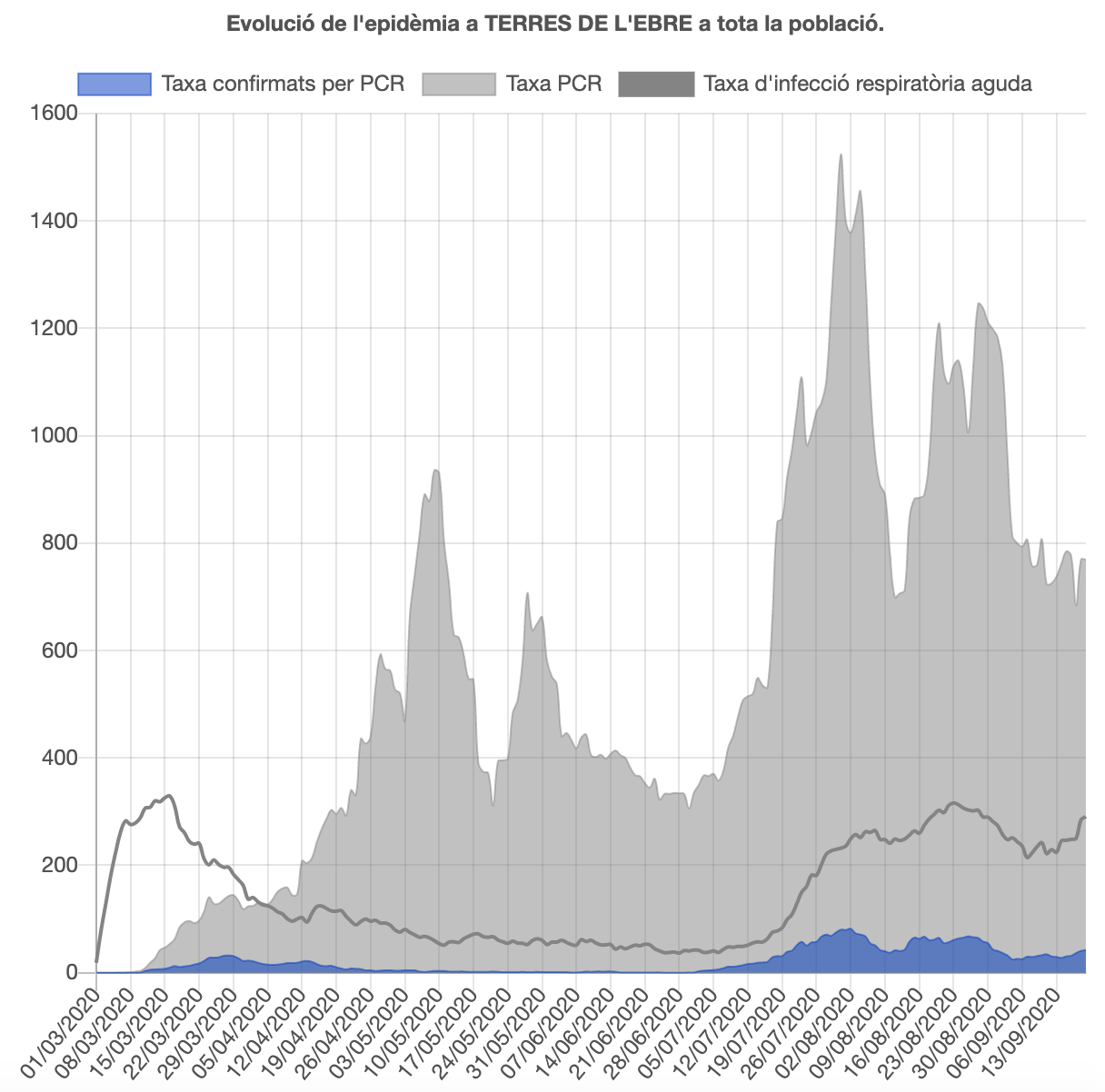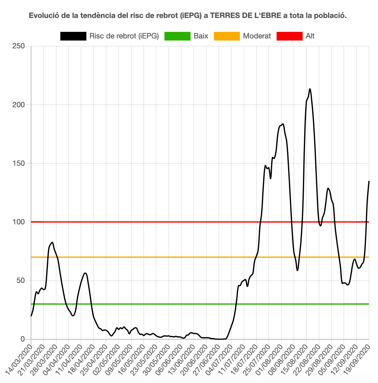 La regió de les Terres de l’Ebre acumula, des de l’inici de la pandèmia, 1.120 casos confirmats per PCR, 6 més que en el balanç anterior, i 1.307 si es tenen en compte la resta de proves, és a dir, 7 positius nous en total respecte a ahir. En aquesta regió han mort 65 persones, cap més respecte a l’últim balanç. El risc de rebrot s’ha disparat i ha augmentat en un dia 20,61 punts i se situa al 135,03, a risc alt. Una xifra que no es veia des del passat 20 d’agost. Per altra banda, la taxa de confirmats per PCR en els darrers set dies és de 42,33 per 100.000 habitants, mentre que l’Rt, és a dir, la velocitat de propagació del virus és d’1,94 i ha pujat 0,3 respecte a les dades anteriors. Segons aquest últim balanç hi ha 4 pacients ingressats als hospitals, un més, un dels quals a l’UCI.