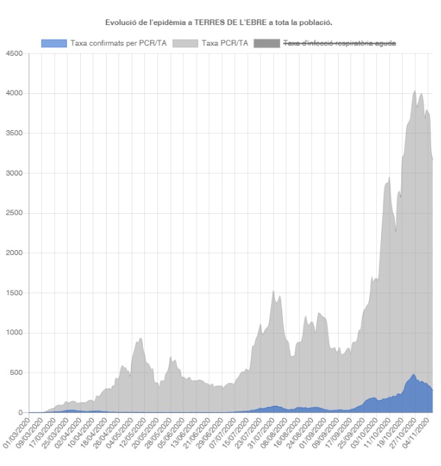 La regió sanitària de les Terres de l’Ebre acumula, des de l’inici de la pandèmia, 4.476 casos confirmats per PCR o antígens, 42 més que en el balanç anterior, 4.690 si es tenen en compte la resta de proves, és a dir, en total 42 positius més. En aquesta regió han mort 86 persones, cap augment respecte l’últim balanç. Entre el 29 d’octubre i el 10 de novembre es van notificar 8 defuncions, 4 en l’interval anterior.