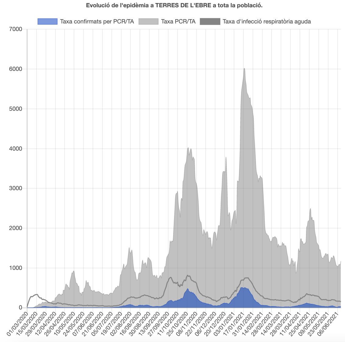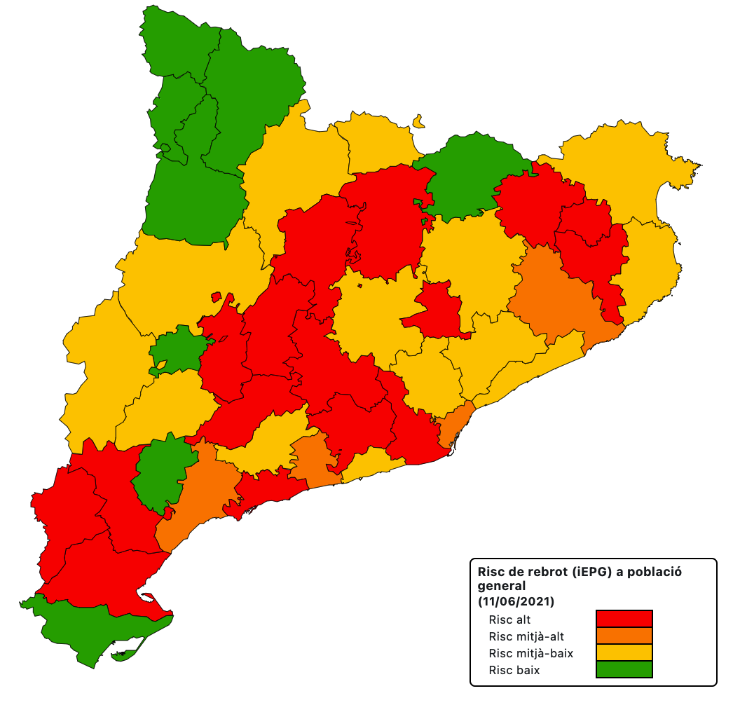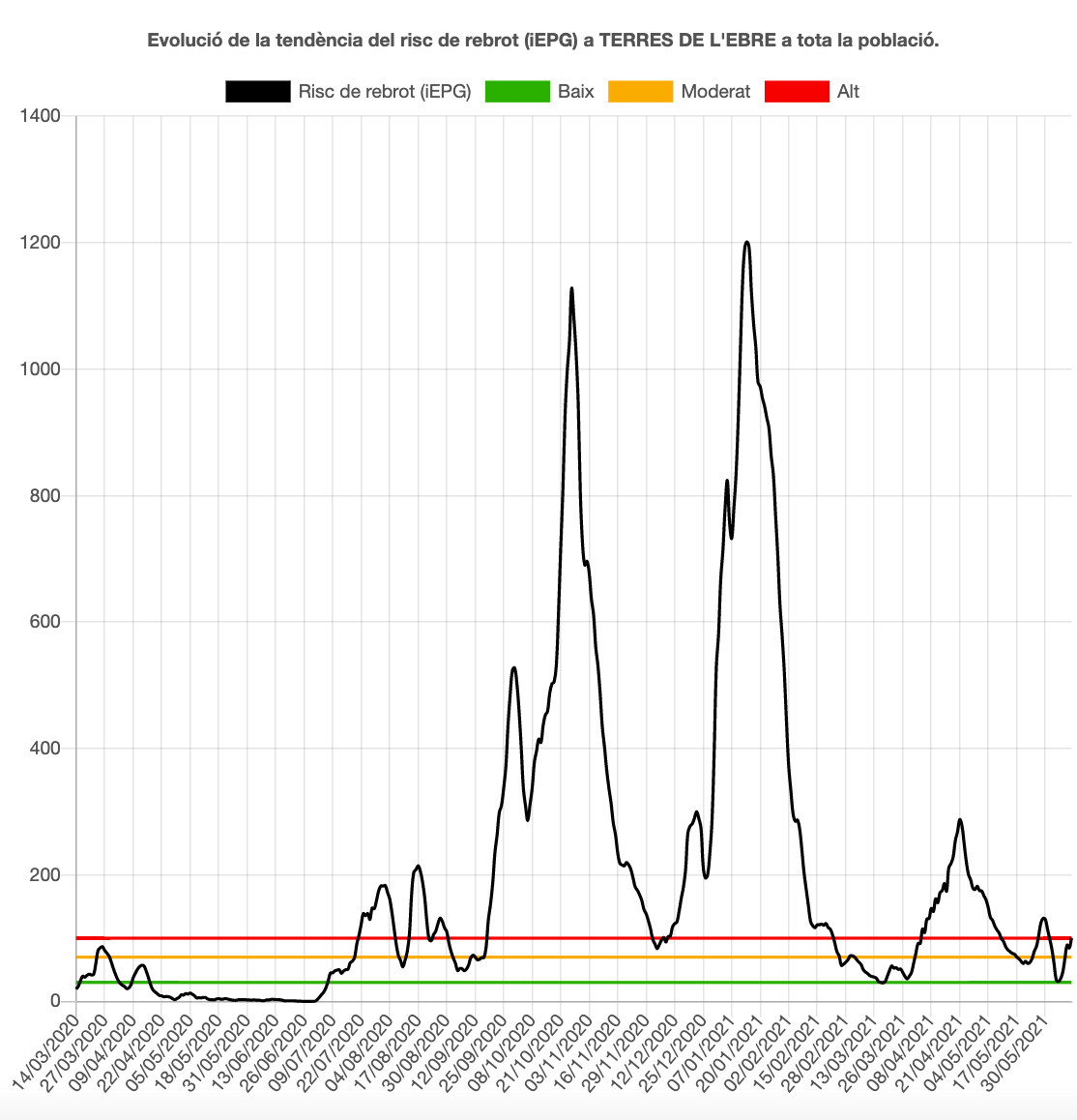 La velocitat de propagació de la Covid-19 (Rt) puja a 1,87 a les Terres de l’Ebre, vint-i-quatre centèsimes més que ahir, i com és superior a l’1 significa que la pandèmia creix. El risc de rebrot torna a pujar i ho fa 18 punts fins a 100 (alt). Per comarques, el risc de rebrot és baix al Montsià amb 23 punts, molt alt a la Ribera d’Ebre amb 212 i alt a la Terra Alta amb 126 i al Baix Ebre amb 127 punts. L’Rt és inferior a l’1 al Montsià, de 0,82, d’1,73 al Baix Ebre, de 2,28 a la Terra Alta i de 3,42 a la Ribera d’Ebre.