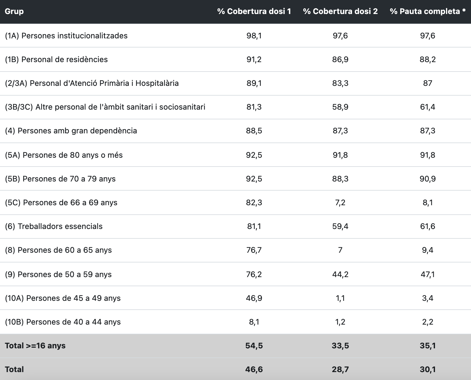 A les Terres de l’Ebre no s’ha detectat cap nova mort i el total és de 180. Els vacunats de la primera dosi arriben a les Terres de l’Ebre a 84.293 (46,6%) i a 51.922 (28,7%) els vacunats de la segona i hi ha 54.364 persones amb la pauta completa (30,1%), segons dadescovid.cat. Els vacunats de la primera dosi majors de 16 anys son el 54,5% i amb la pauta completa el 35,1%. El 76,2% de la població ebrenca de 50 a 59 anys ja s’ha vacunat amb una dosi, també ho han fet un 46,9% de les persones d’entre 45 o 49 anys i un 8,1% de les de 40 a 44 anys.