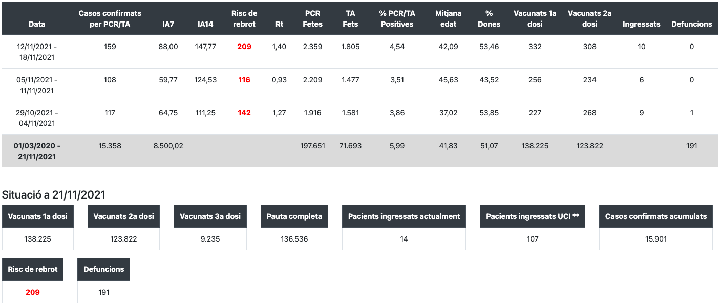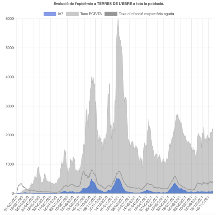 Segons dadescovid.cat, hi ha 18 persones ingressades per Covid-19, 14 de les quals a planta i 4 a l’UCI. A les Terres de l’Ebre han mort 191 persones des de l’inici de la pandèmia, cap més. Les dues últimes defuncions daten 30 de setembre i del 29 d’octubre. La incidència a 7 dies és de 88 i a 14 dies és de 148. El 4,54% de les proves que es fan donen positiu.