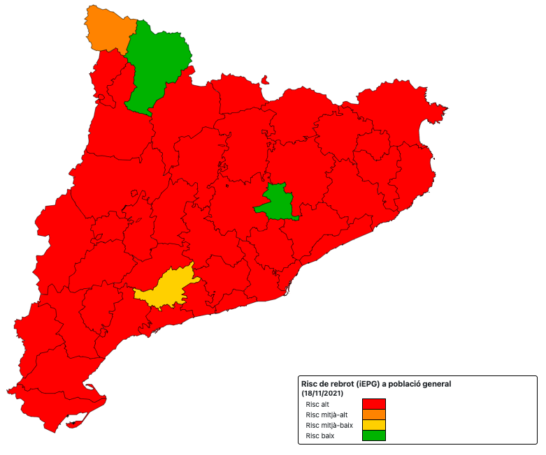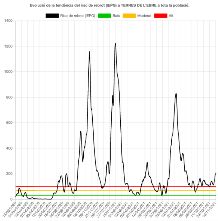 La pandèmia de la Covid-19 va a l’alça, ja que la velocitat de contagi (Rt) supera l’1, però baixa tres centèsimes fins a 1,40. El risc de rebrot puja i ho fa 11 punts fins a 209, risc molt alt. No es registrava a l’Ebre aquesta xifra tan alta de risc des de fa dos mesos, des de finals del mes d’agost. Té un risc alt la Terra Alta (110) i molt alt el Baix Ebre (211), el Montsià (227) i la Ribera d’Ebre (328).