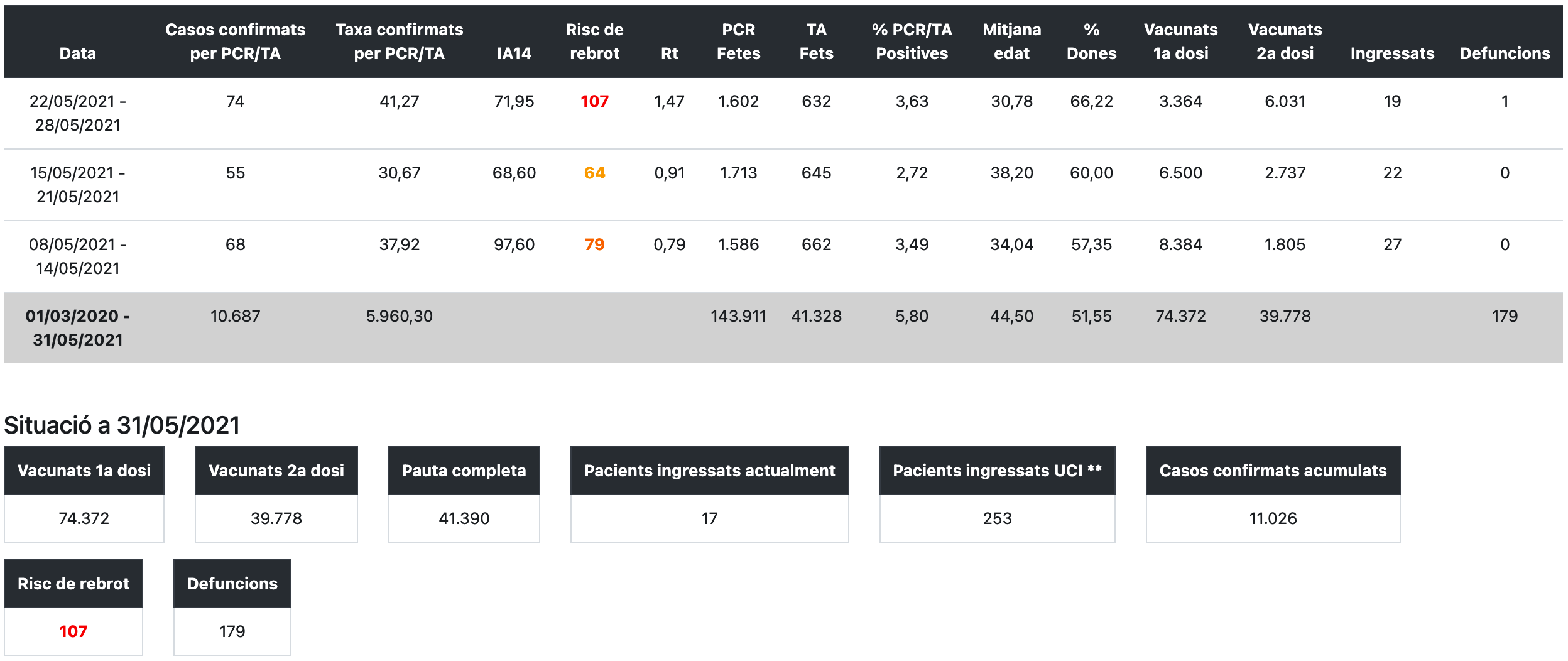 La taxa de confirmats per PCR o TA entre el 22 i el 28 de maig és de 41 per cada 100.000 habitants i durant aquest període s’han detectat 74 positius, més que la setmana anterior quan se’n van detectar 55. A hores d’ara el 3,63% de les proves que es fan donen positiu.