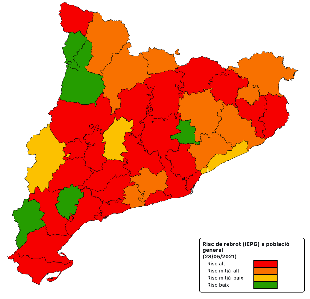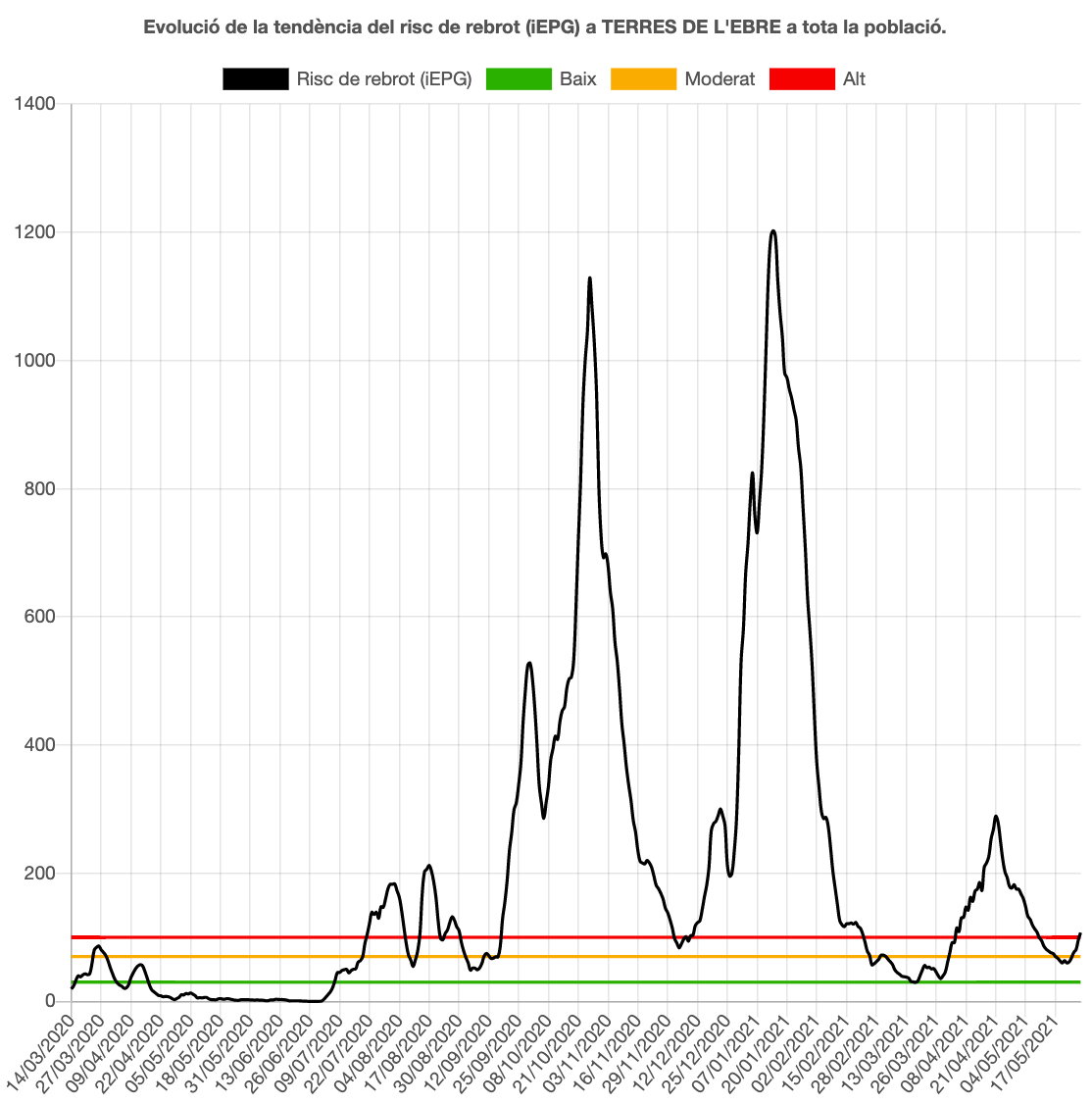 La velocitat de propagació de la Covid-19 (Rt) puja fins a l’1,47 a les Terres de l’Ebre, tretze centèsimes més que ahir i com és superior a l’1 significa que la pandèmia creix. L’Rt és superior a l’1 des del dissabte i feia un mes, des del 29 d’abril, que no es registrava una velocitat de propagació superior a l’1. El risc de rebrot puja i ho fa 11 punts fins a 107 (alt). Per comarques, el risc de rebrot a la Ribera d’Ebre és de 184 (alt), a la Terra Alta de 0 (baix), al Baix Ebre de 146 (alt) i al Montsià de 164 (alt).